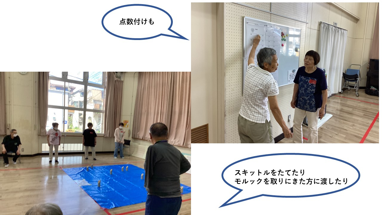 モルックはみんなで協力して運営をしております。審判や得点つけなど順番でおこなっていきます。