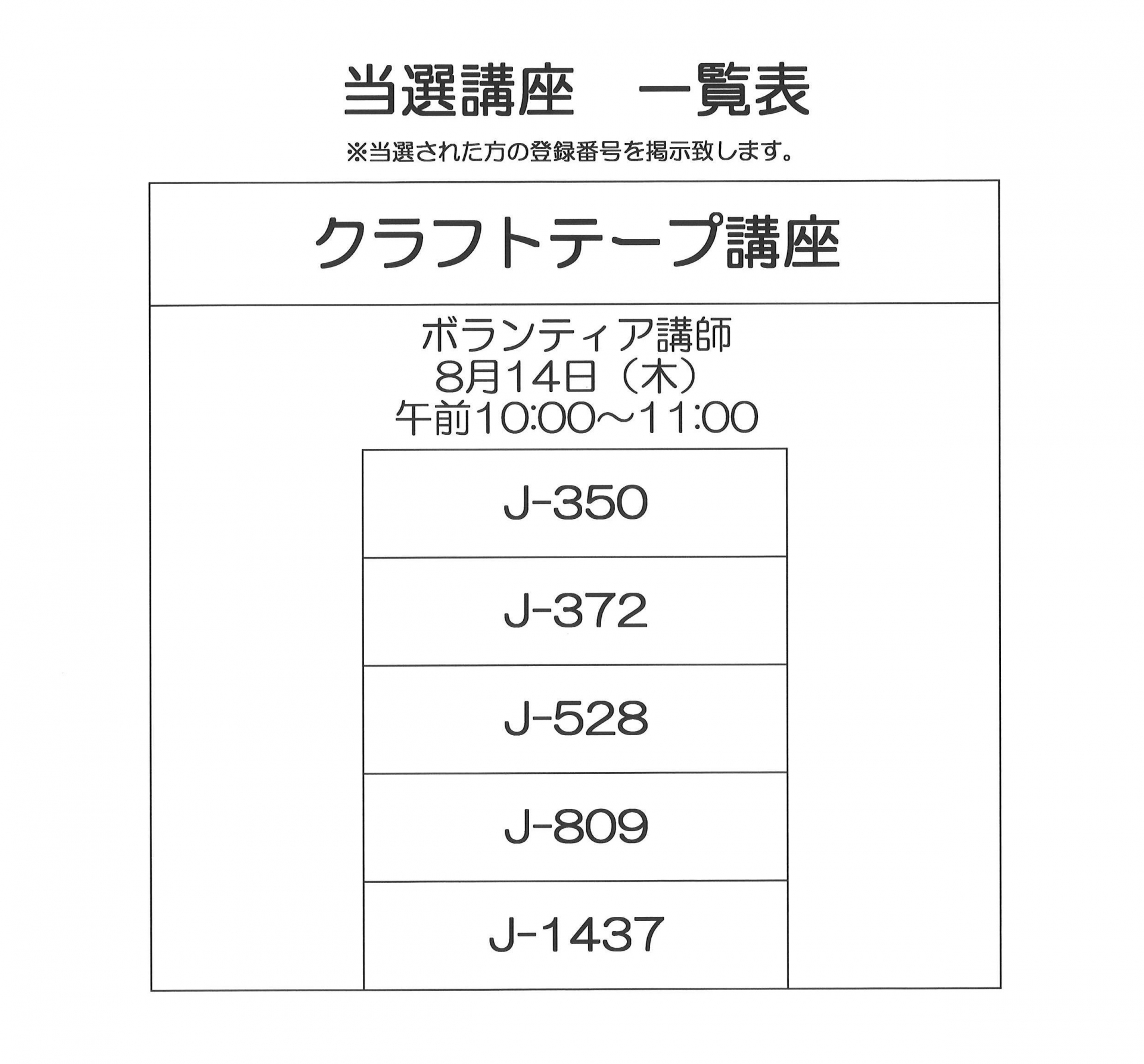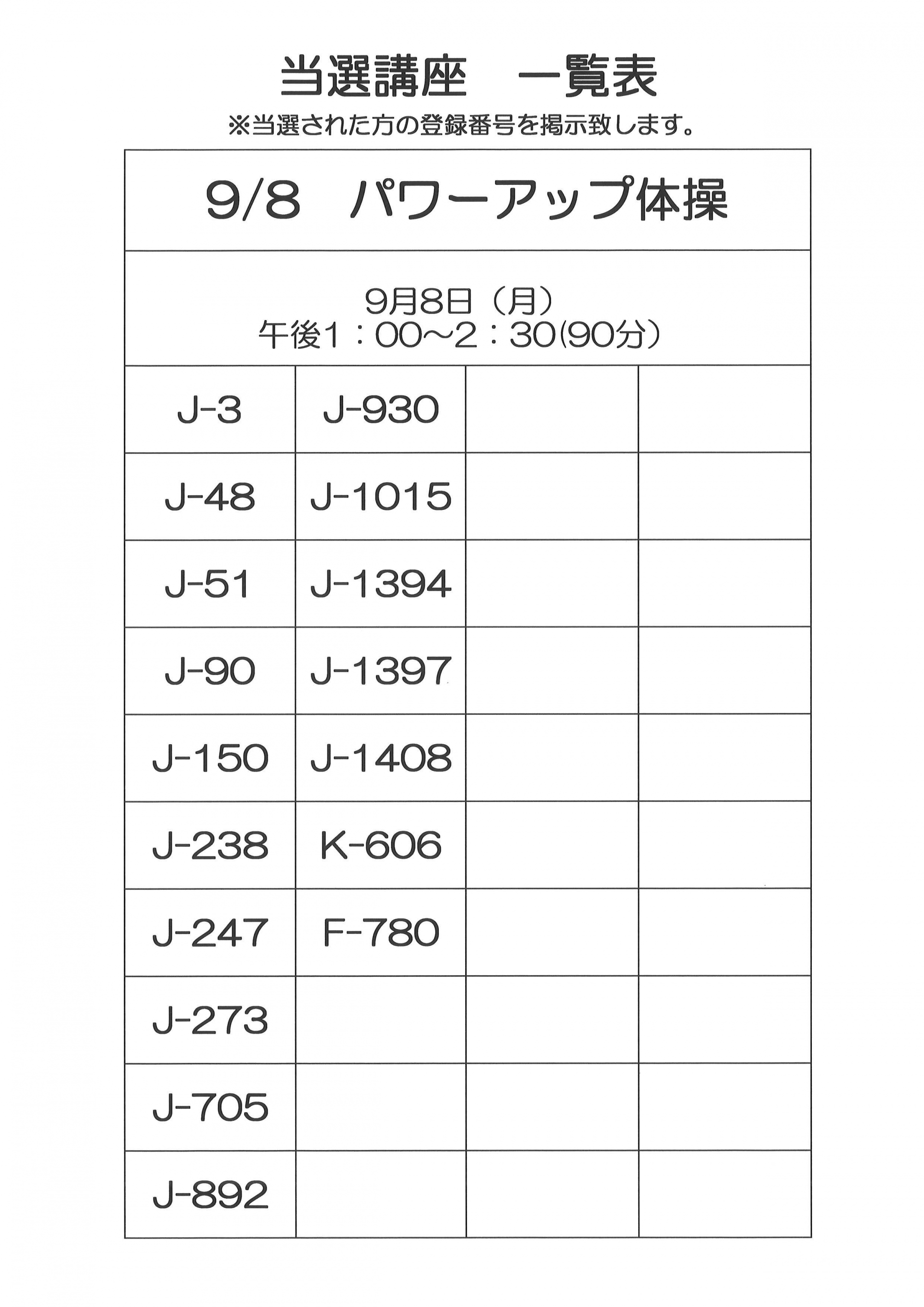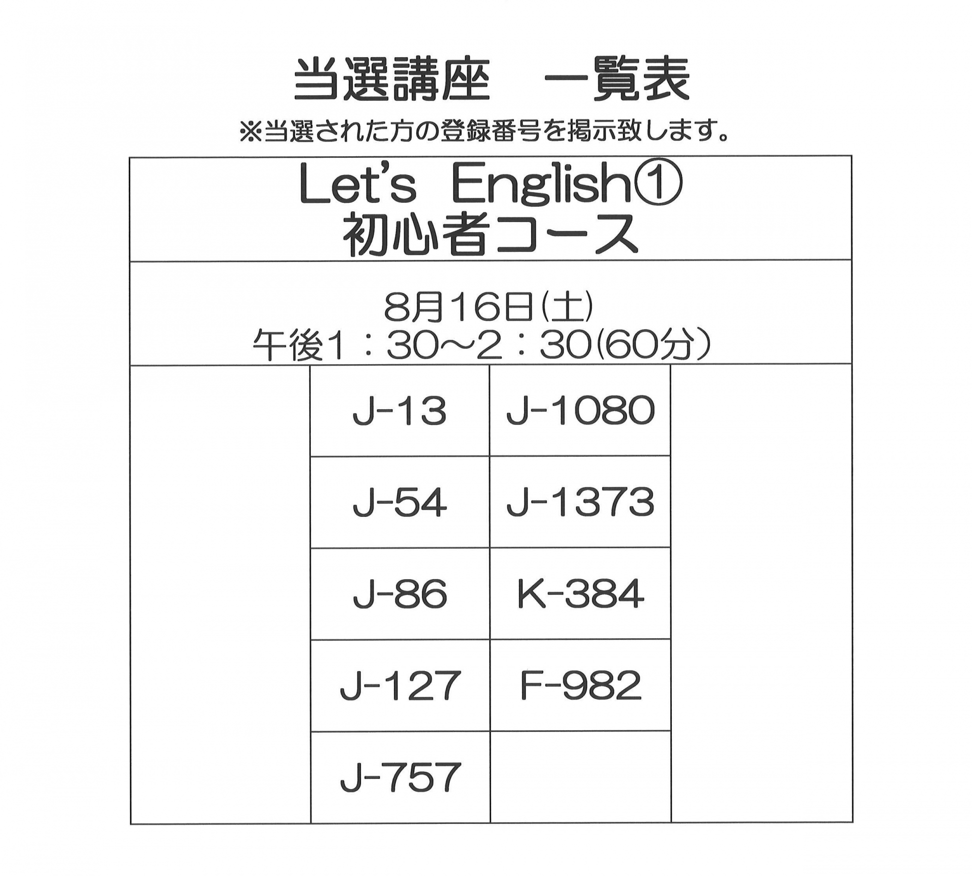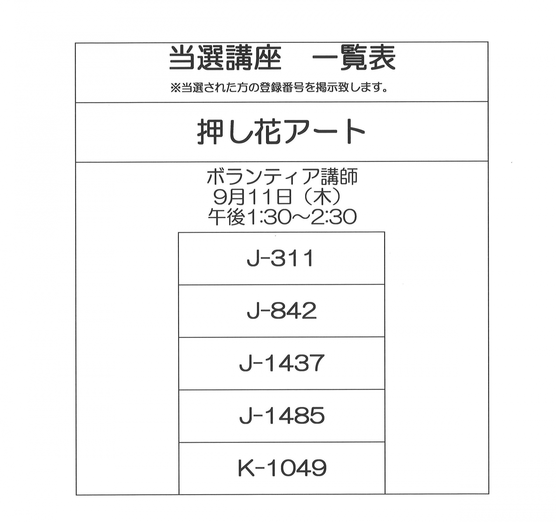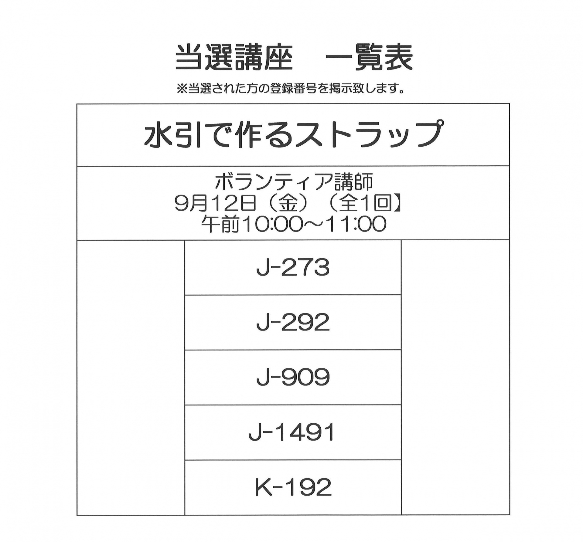 2025.08.06 お知らせ 8月・9月開催 単発講座 当選者一覧 Tweet シェアする いつもセンターをご利用いただきありがとうございます。8月・9月開催 単発講座の当選者一覧です。ご不明な点は、センターまでご連絡ください。よろしくお願いいたします。 前の記事 2025.08.06 お知らせ 8月・9月開催 単発講座 追加募集について 次の記事 2025.08.05 お知らせ 楽々チェア体操を開催しました 一覧へ戻る