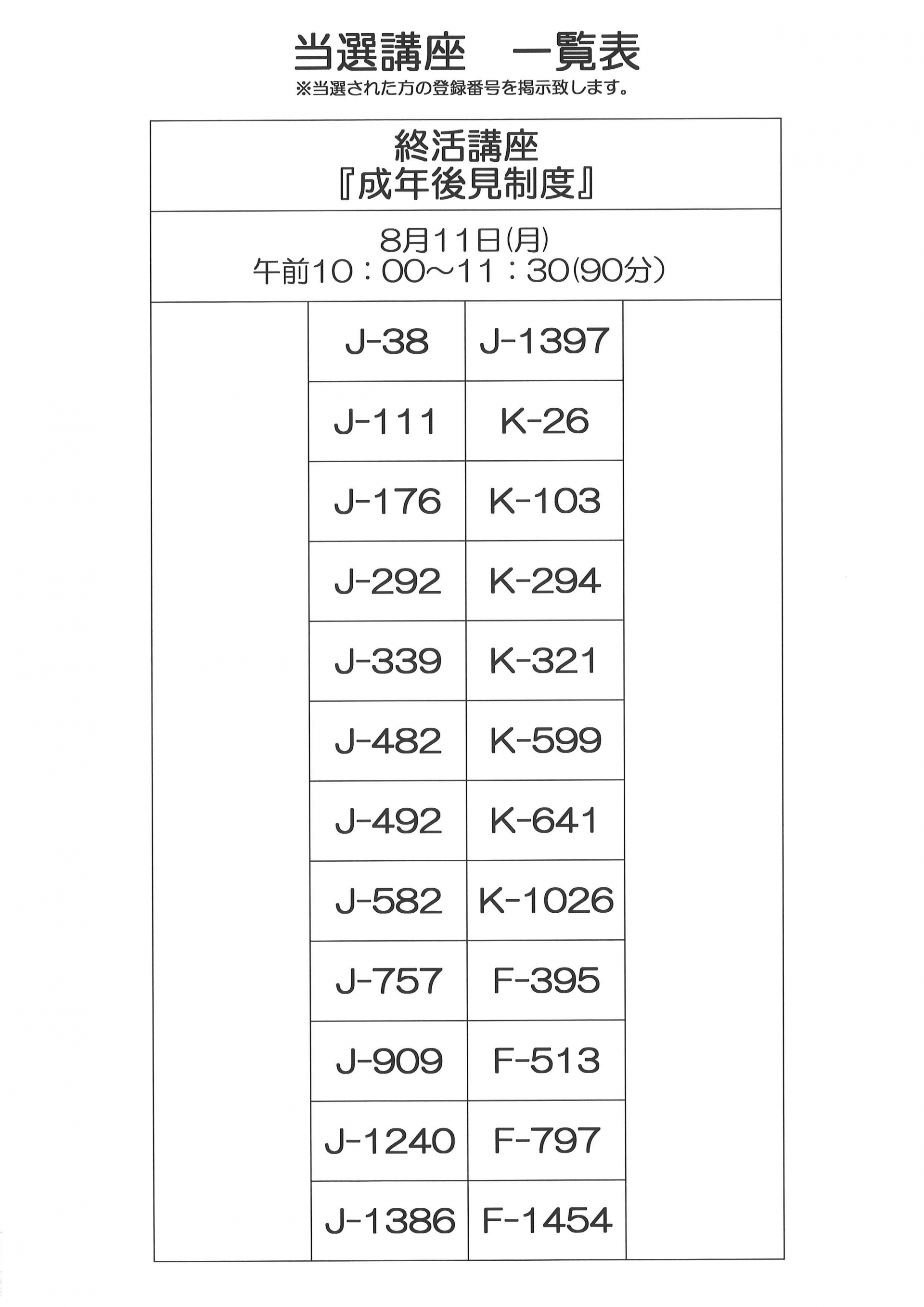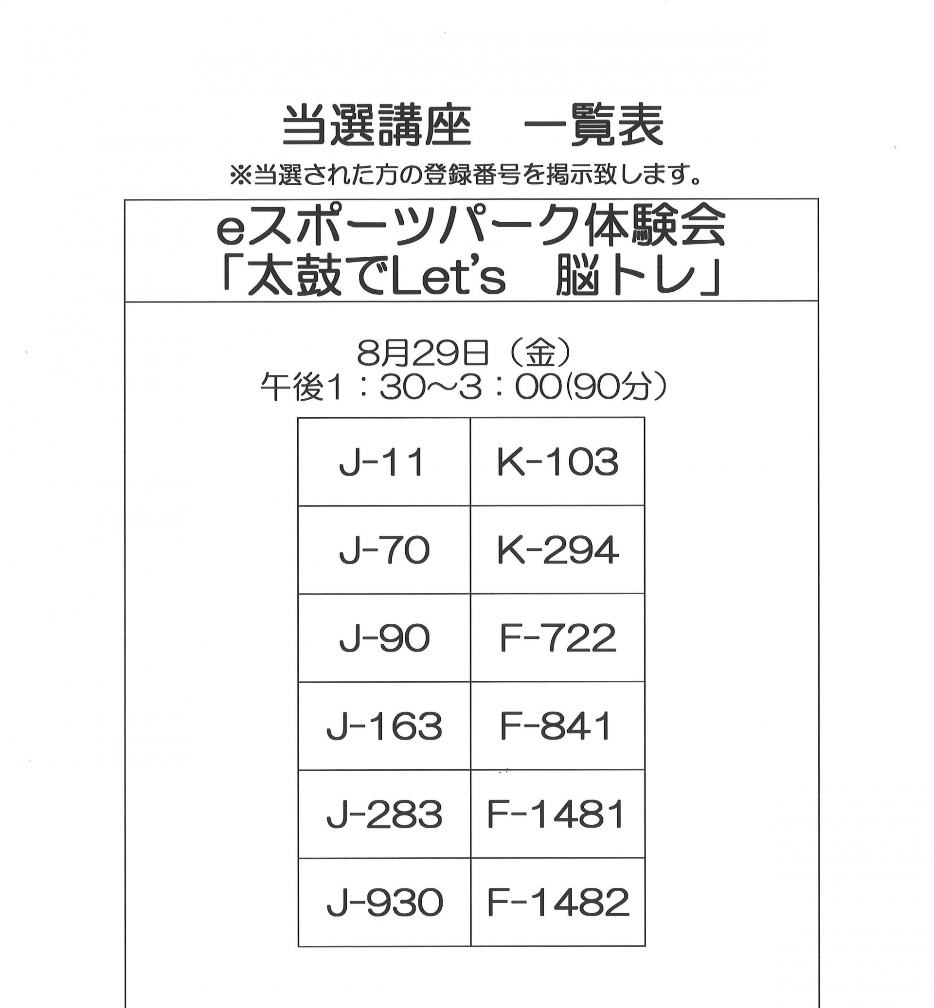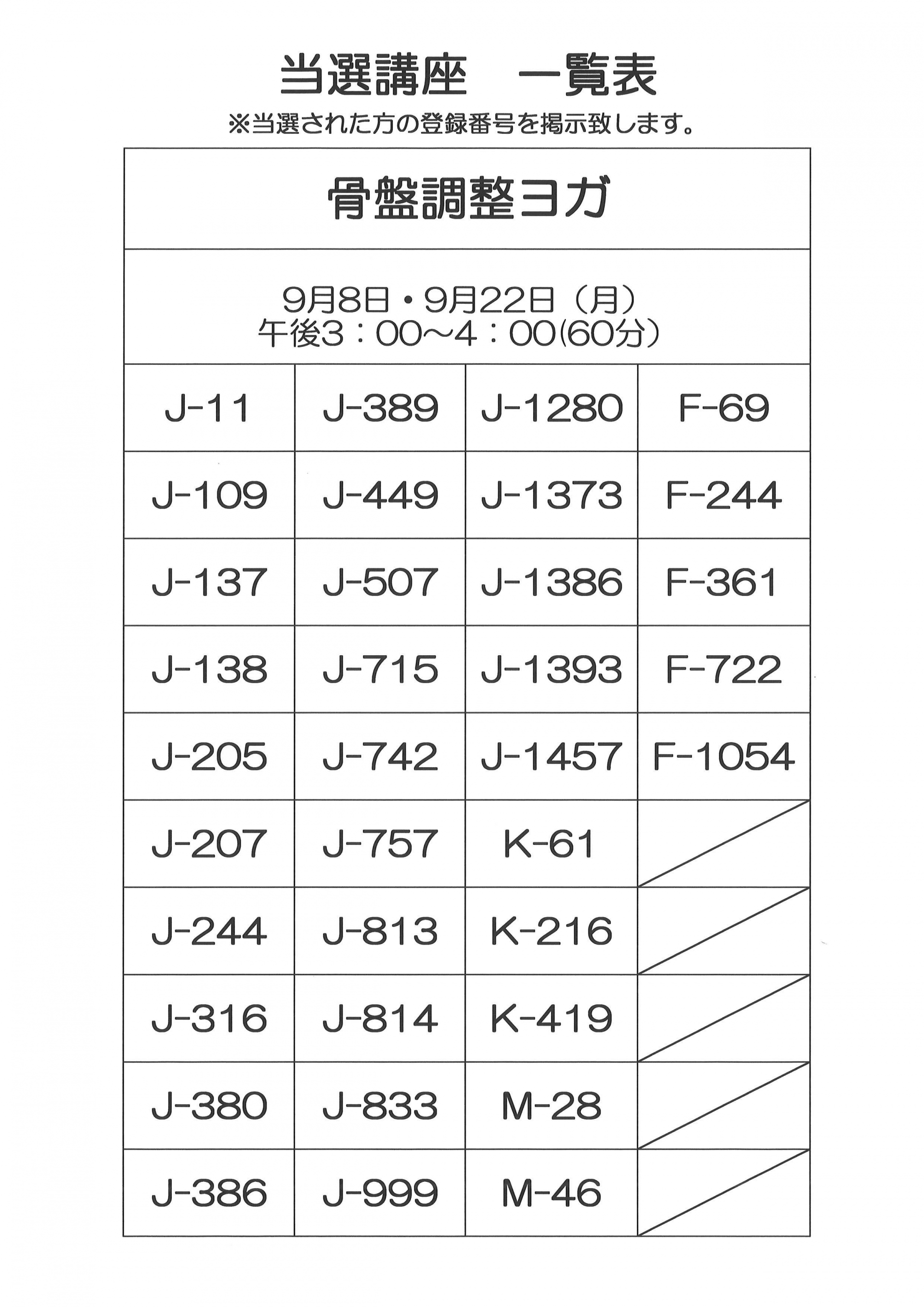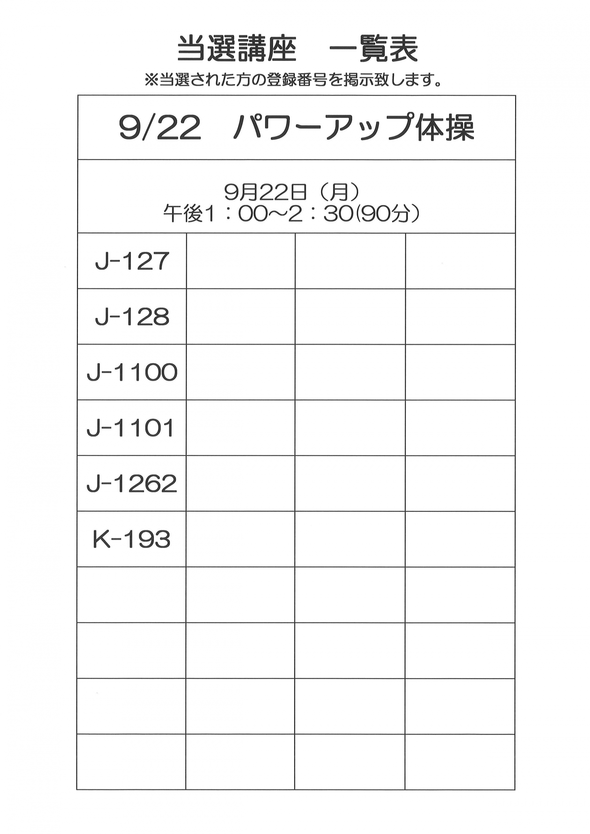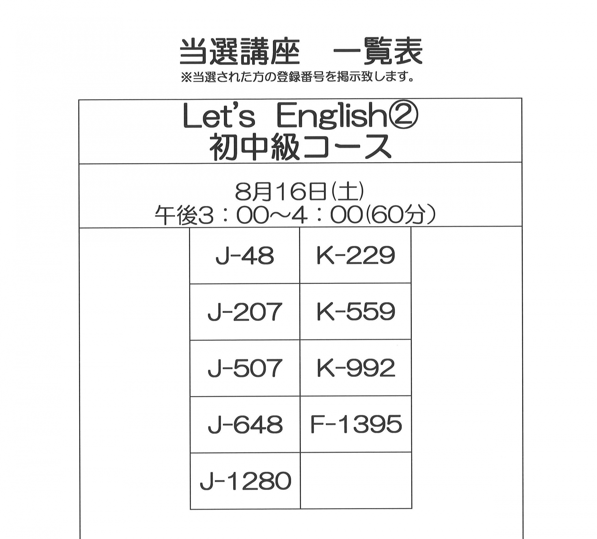 2025.08.06 お知らせ 8月・9月開催 単発講座 当選者一覧 Tweet シェアする いつもセンターをご利用いただきありがとうございます。8月・9月開催 単発講座の当選者一覧です。ご不明な点は、センターまでご連絡ください。よろしくお願いいたします。 前の記事 2025.08.06 お知らせ 8月・9月開催 単発講座 追加募集について 次の記事 2025.08.05 お知らせ 楽々チェア体操を開催しました 一覧へ戻る