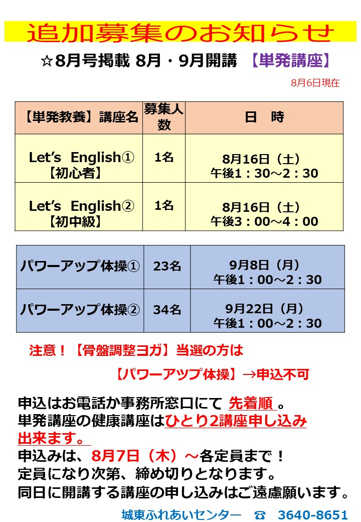 8月号掲載8月・9月開催 単発講座の追加募集のお知らせです。