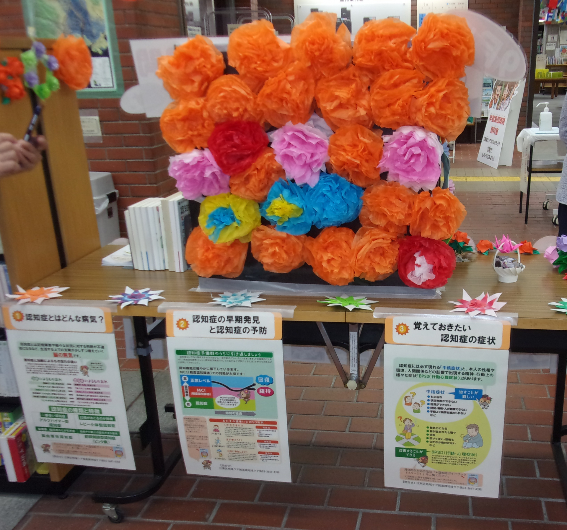認知症関連の本の周りを、有志の方々が折った作品で飾らせて頂きました。一か月間展示しています。