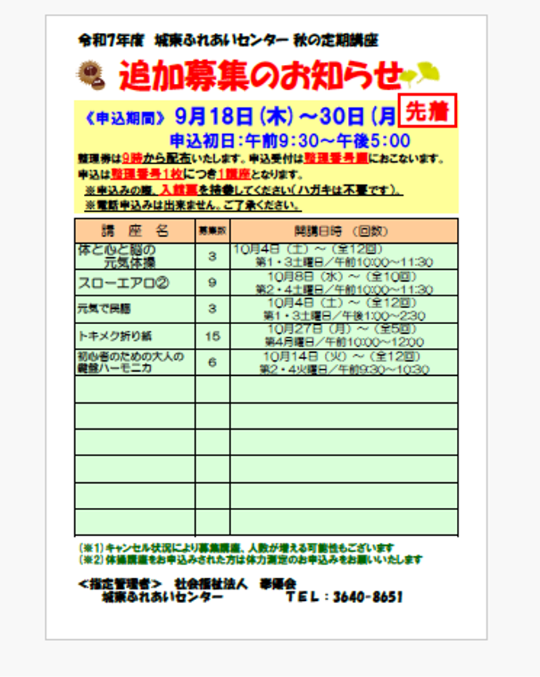 10月開講定期講座の健康講座、教養講座の追加募集のお知らせです。