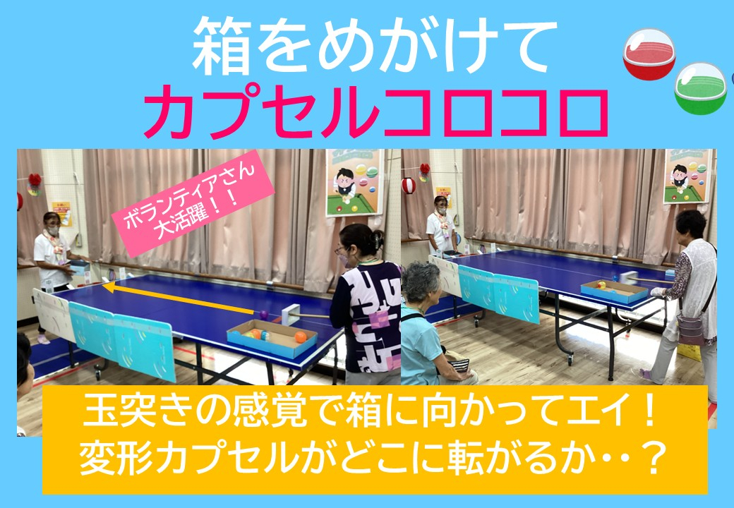 卓球台を使いビリヤードのような感じで、カプセルを突いて前の箱に入れるというゲームです。