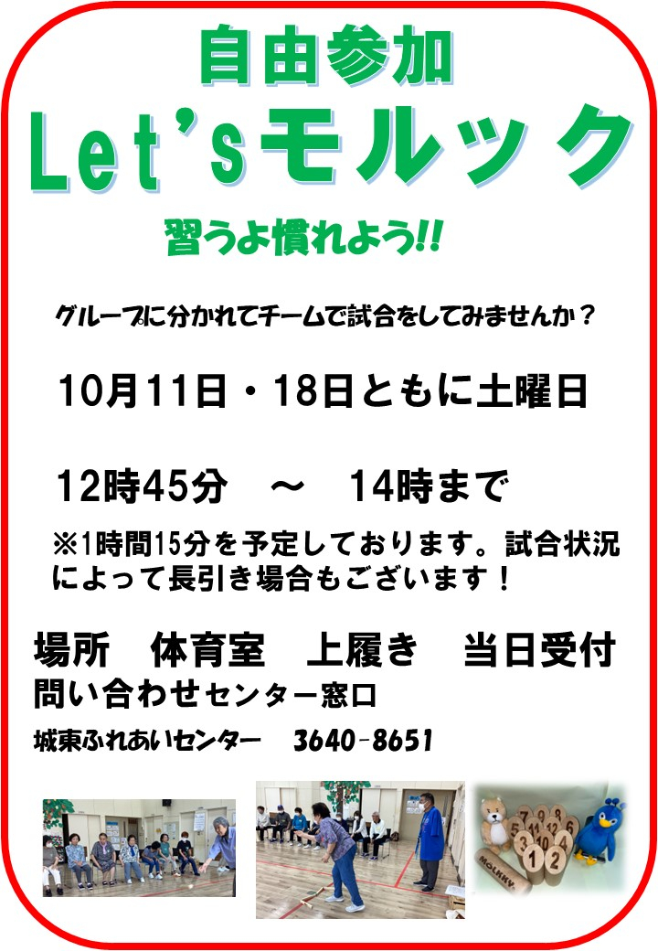 2025.09.21 活動報告 Let'sモルック 10月の予定 Tweet シェアする Let's モルック 10月の予定です。 10月は土曜日のみで2回開催です。 自由参加となります。皆さんのご参加をお待ちしております。 城東ふれあいセンターKC 前の記事 2025.09.22 活動報告 夏フェス2025 in JOTOその2(カプセルコロコロ&もぐら取りゲーム) 次の記事 2025.09.20 活動報告 ゆうゆう体操700回&400回達成! 一覧へ戻る