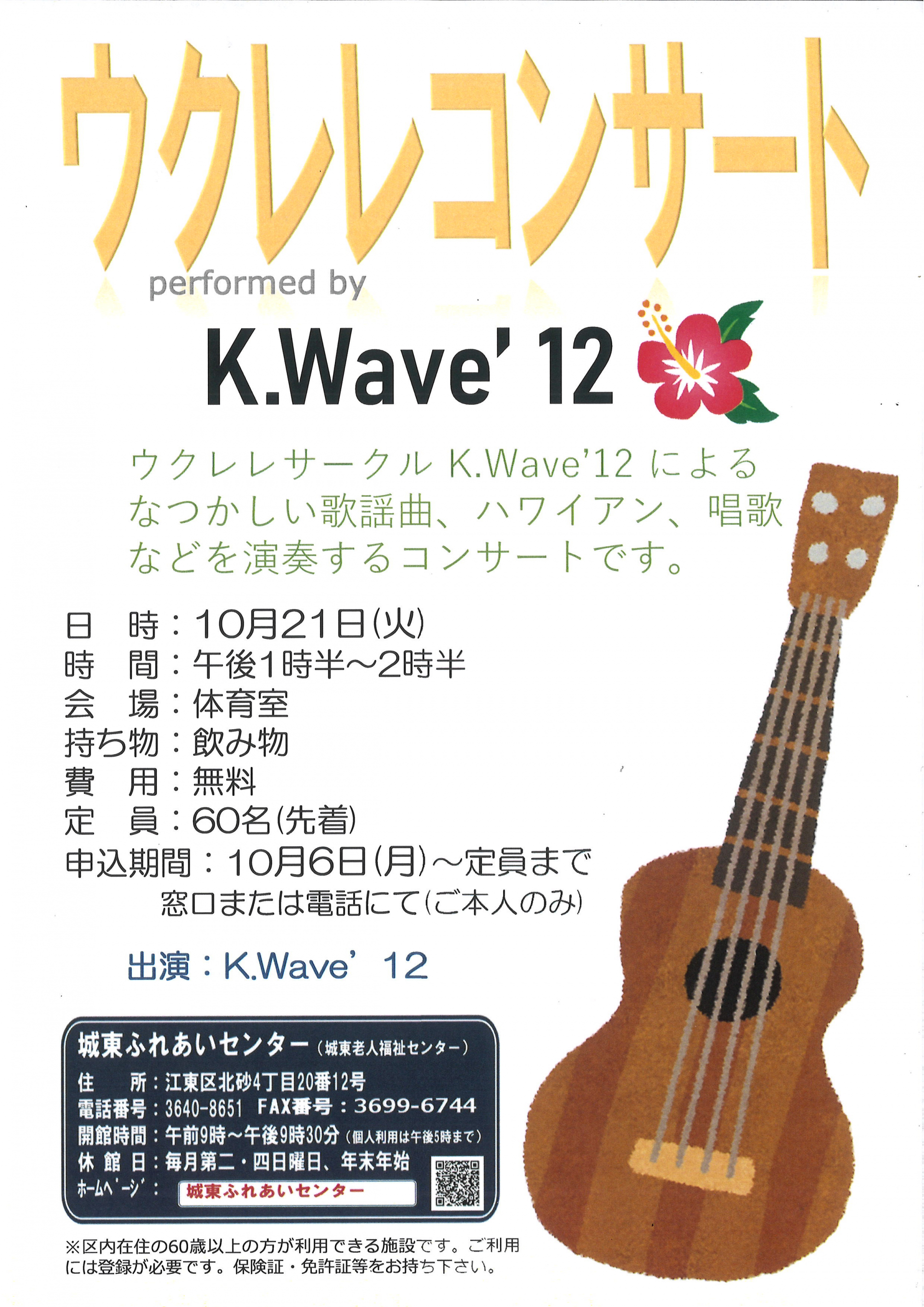 センターを利用されている、ウクレレサークルK.Wave’12の皆さんによる【ウクレレコンサート】を開催します。