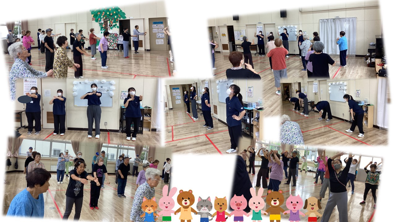 城東ふれあいセンターでは、毎朝の職員がおこなうゆうゆう体操を、実習の最終日には実習生に声掛けをお願いして実施しています。