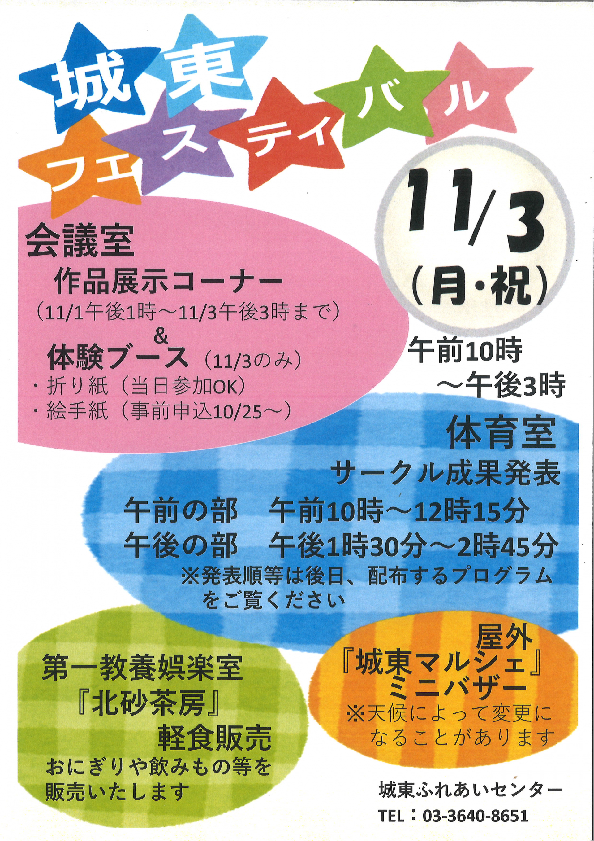 いよいよ11月3日(月・祝)は城東フェスティバル当日となります。