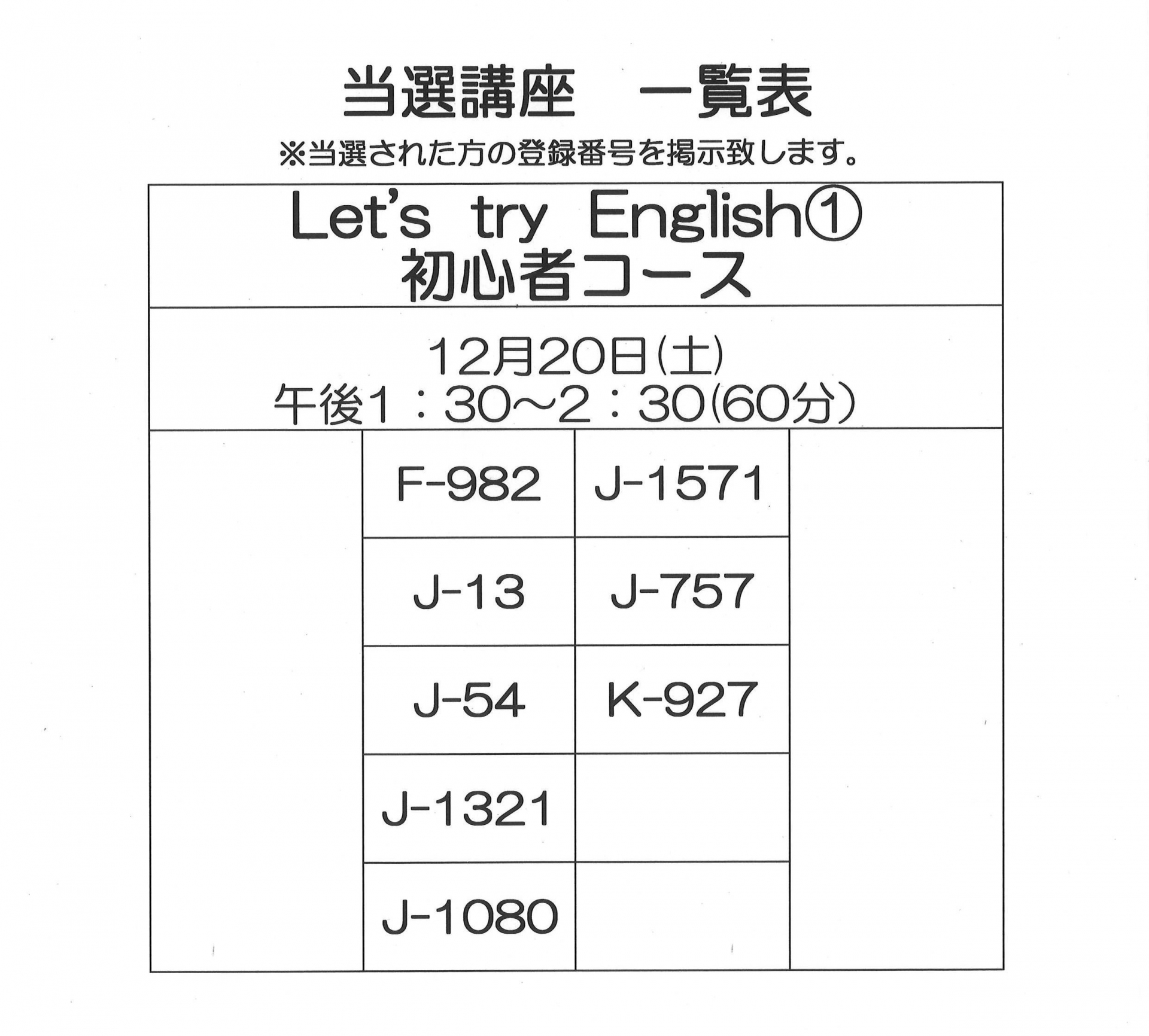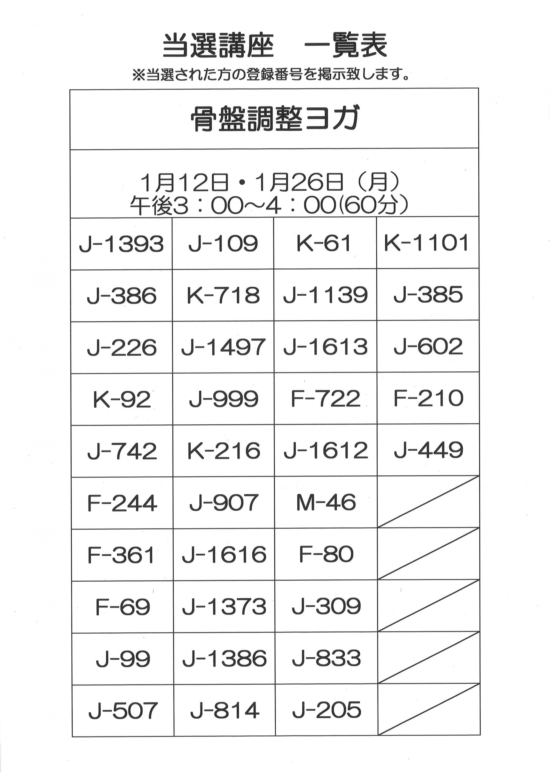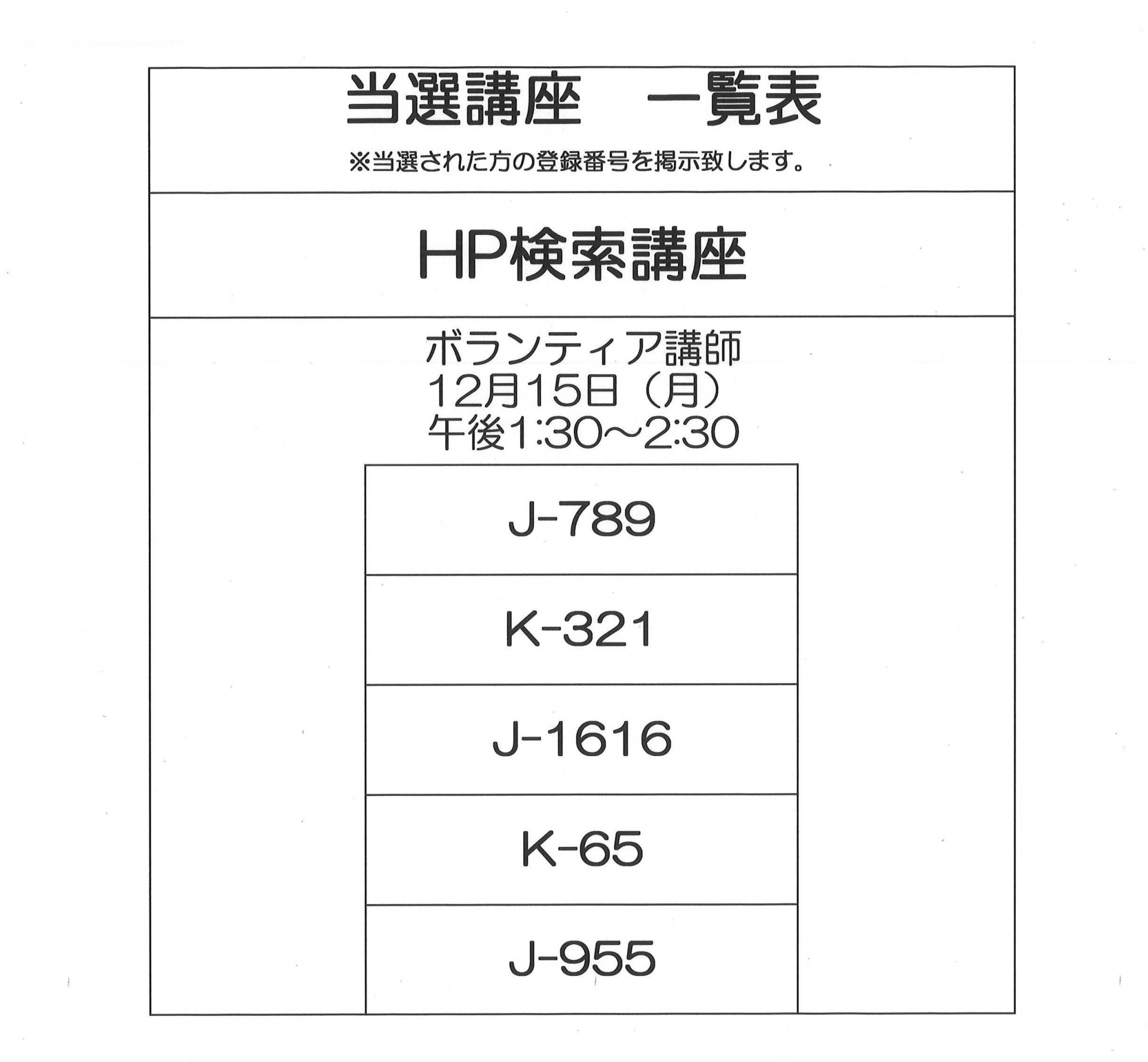 12月・1月開催 単発講座の当選者一覧です。