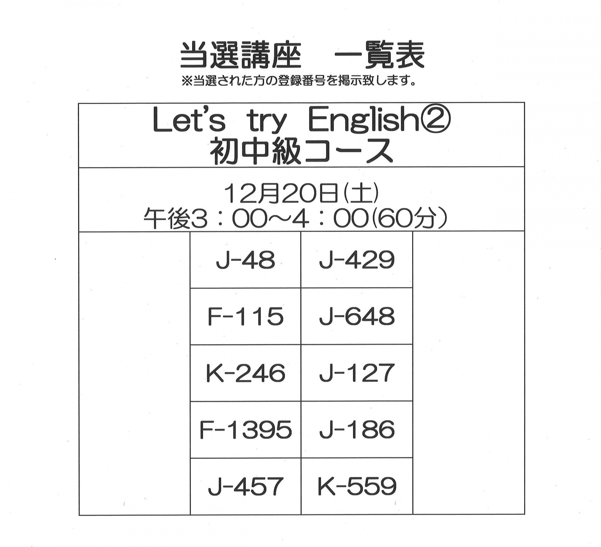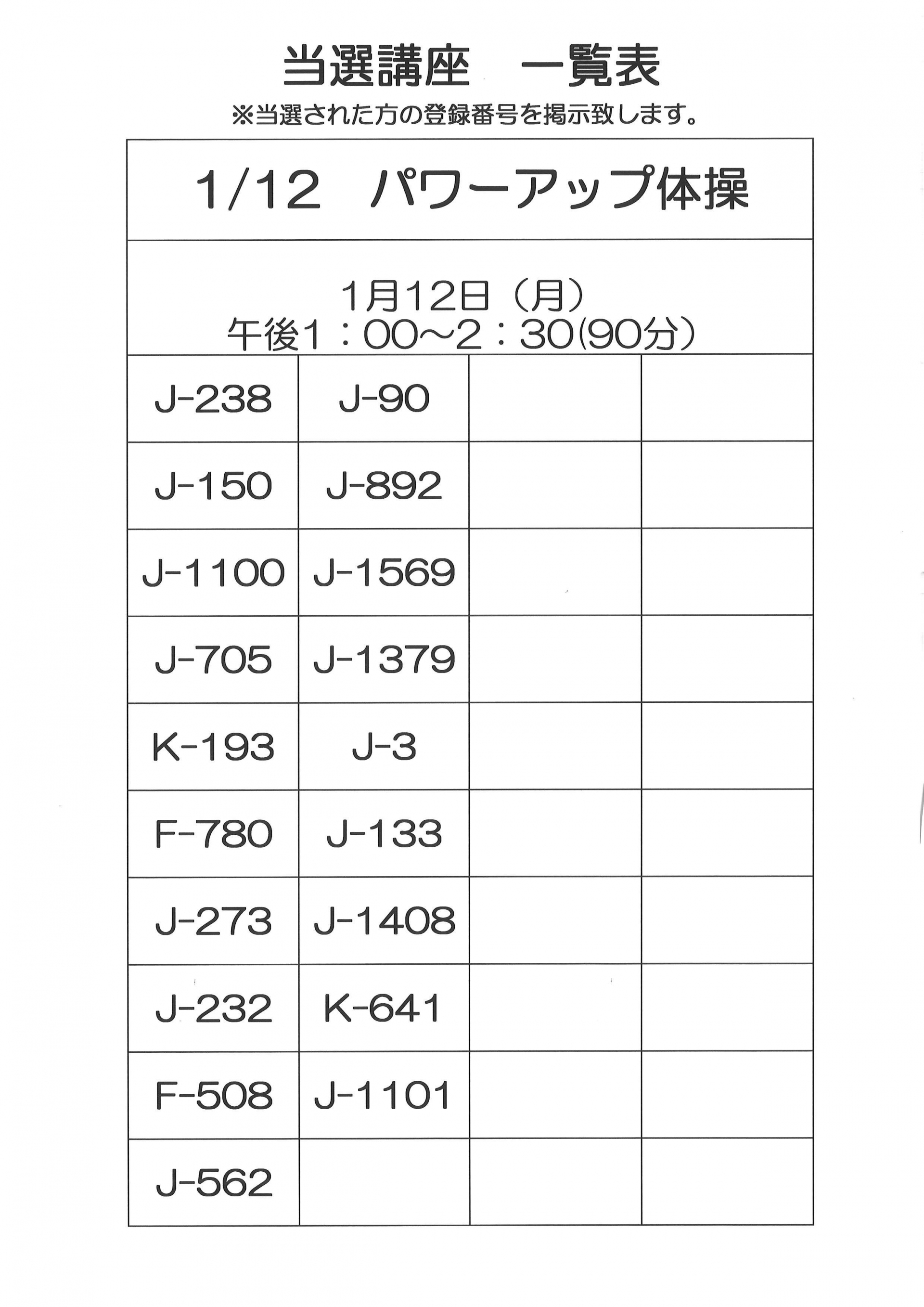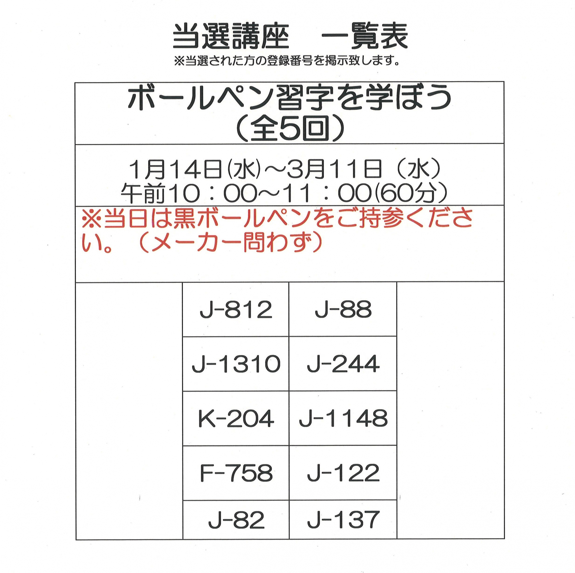 12月・1月開催 単発講座の当選者一覧です。