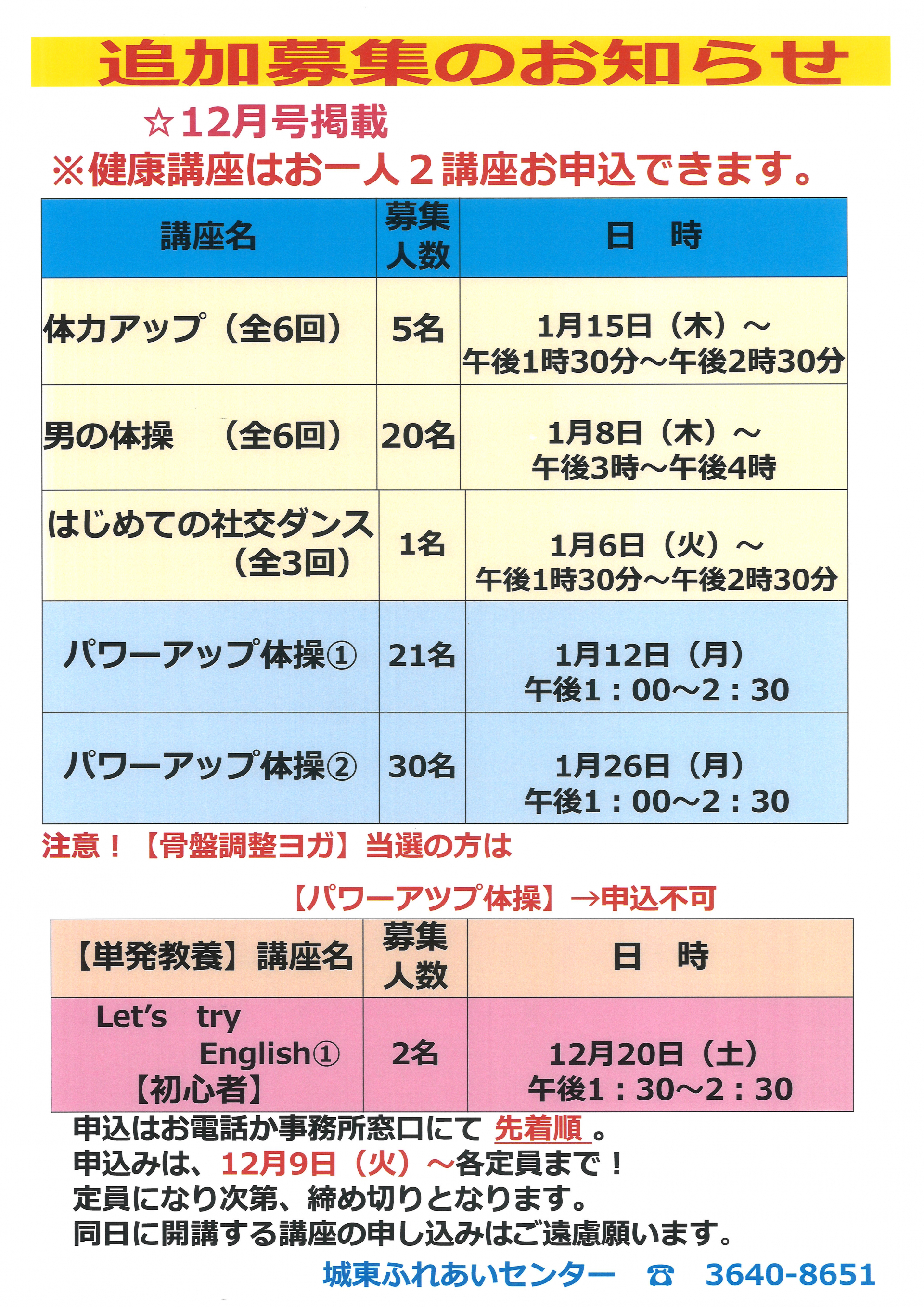 12月号掲載12月・1月開催 単発講座&1月開講3ヶ月講座の追加募集のお知らせです。