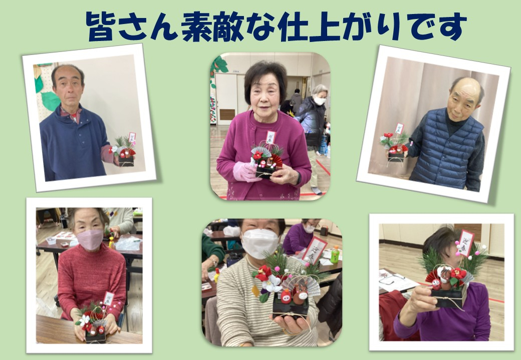枡に松、扇なども飾り、出来上がったねんどの馬とダルマ、つまみ細工の椿の花をバランスよく飾って【新春枡飾り】の出来上がりです!