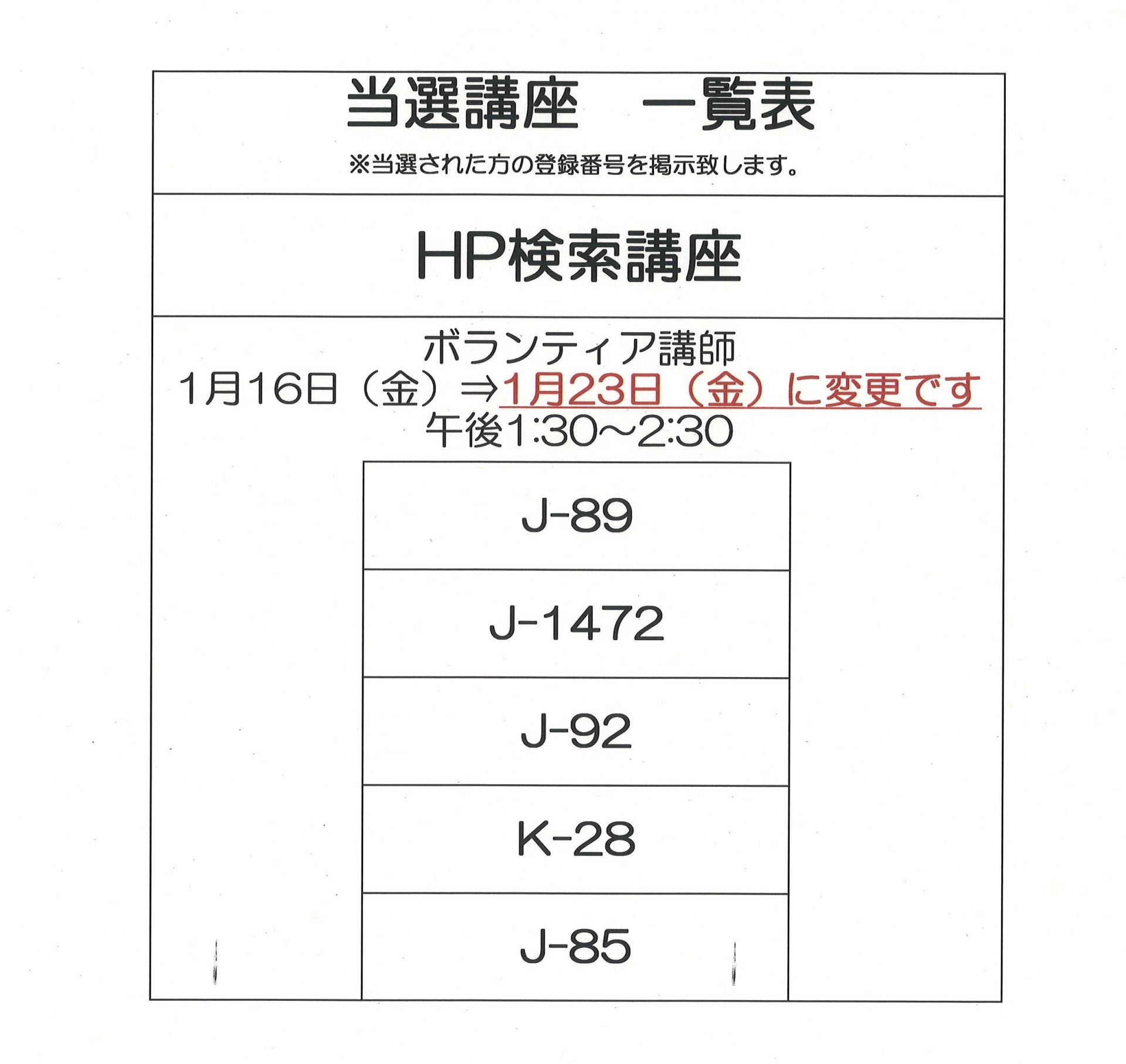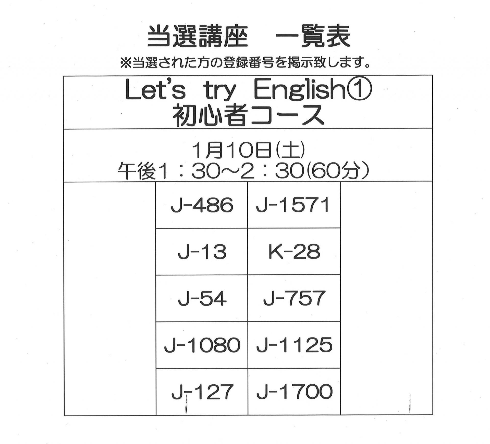 1月開催 単発講座【Let's try English①・②、HP検索講座】の当選者一覧です。