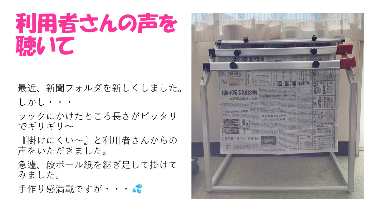 新しい新聞フォルダになりましたが、長さがピッタリすぎてラックに掛けるのが難しいと、利用者さんからの声をいただきました。