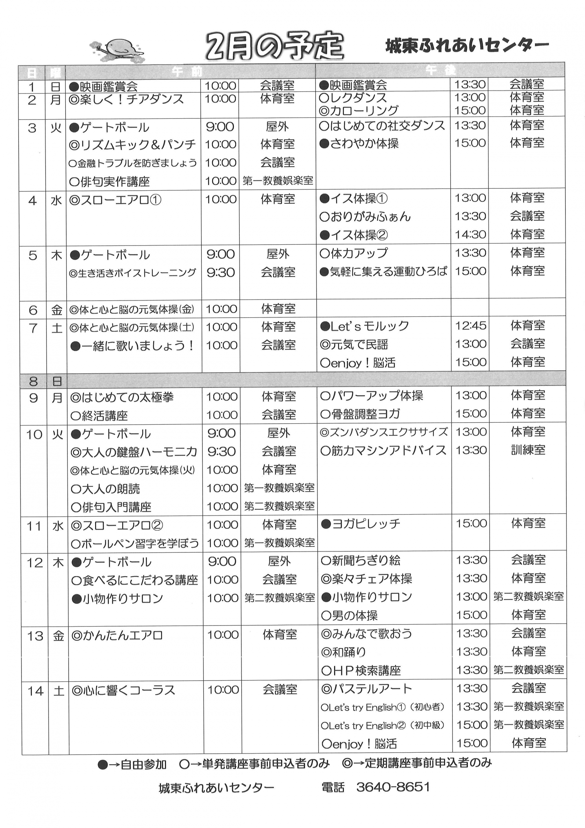 2026.01.24 お知らせ 城東ふれあいセンター2月の予定表 Tweet シェアする 城東ふれあいセンター2月の予定表をお知らせいたします。 城東ふれあいセンター H.A 前の記事 2026.01.26 お知らせ 男の体操 次の記事 2026.01.24 お知らせ 城東ふれあいセンター2月のおたより 一覧へ戻る