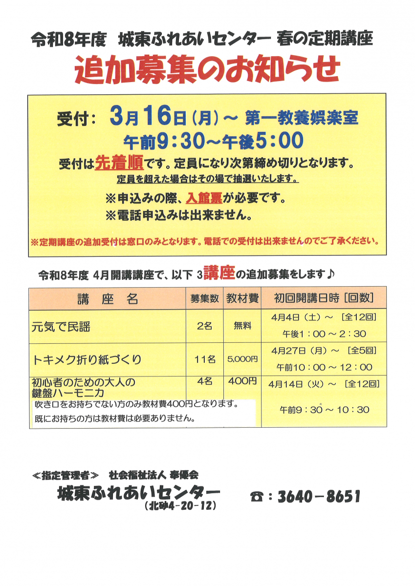 4月開講定期講座 追加募集のお知らせ