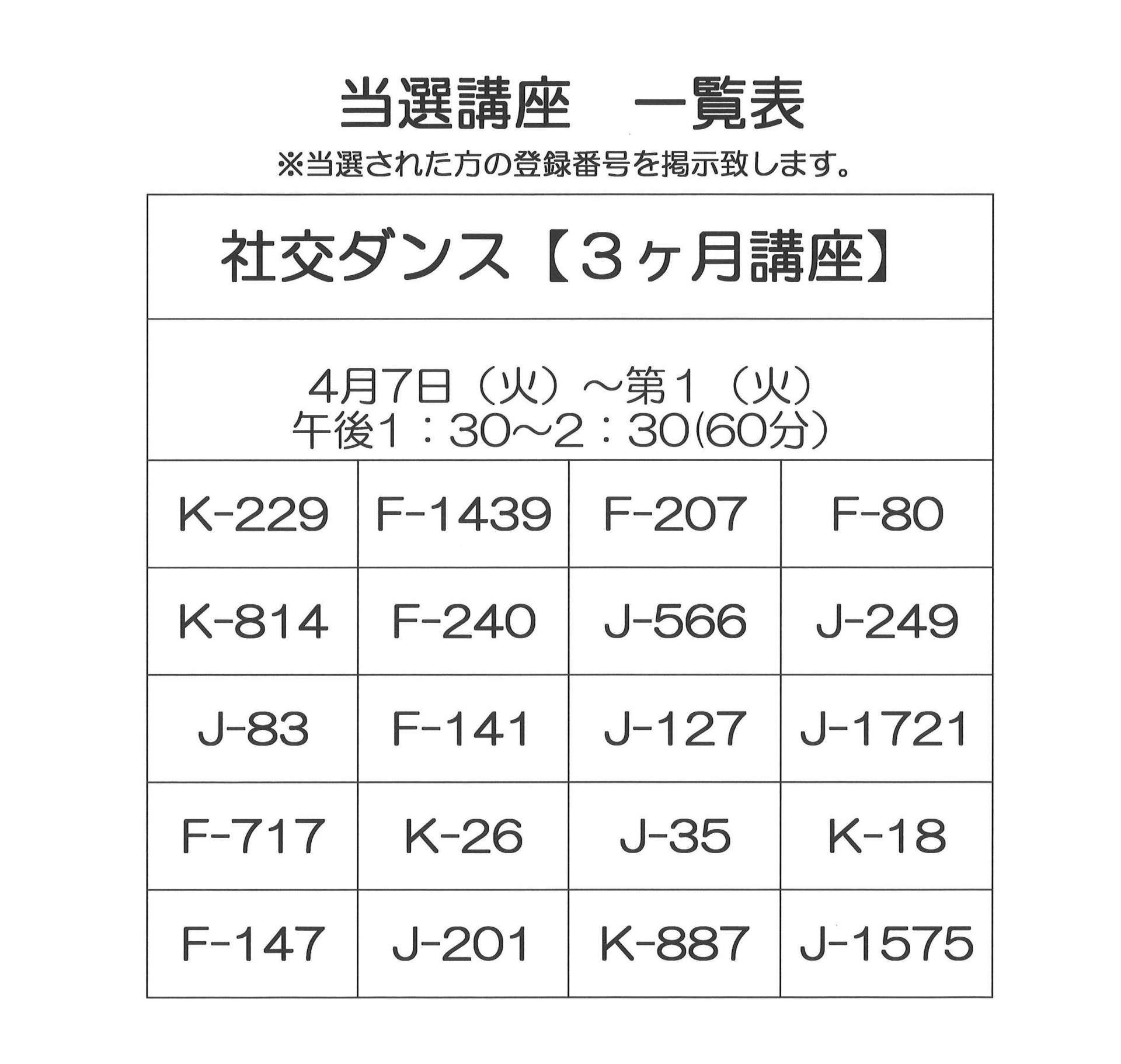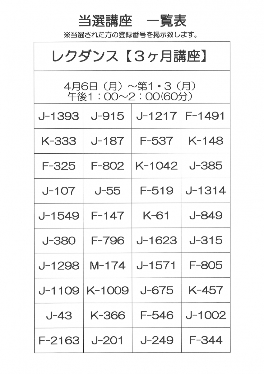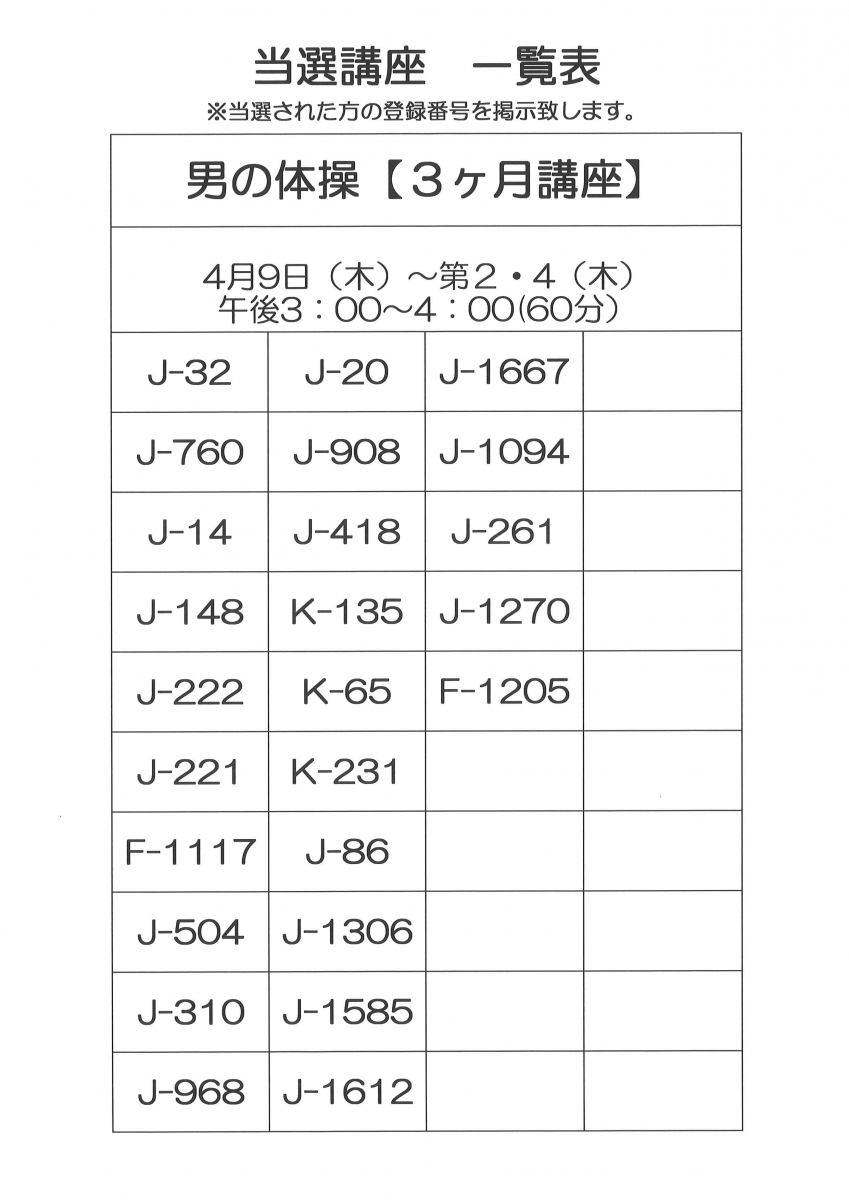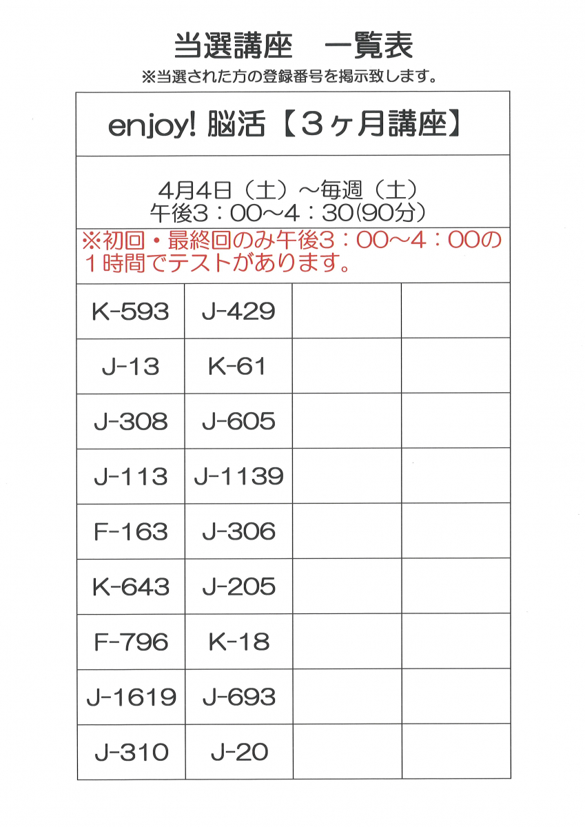令和8年4月開講 3ヶ月講座当選者一覧