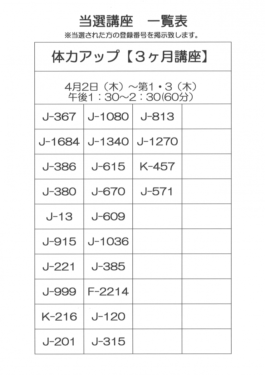 令和8年4月開講 3ヶ月講座当選者一覧です。