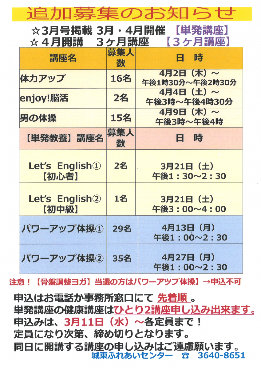 3月・4月開講 単発講座&4月開講 3ヶ月講座 追加募集について