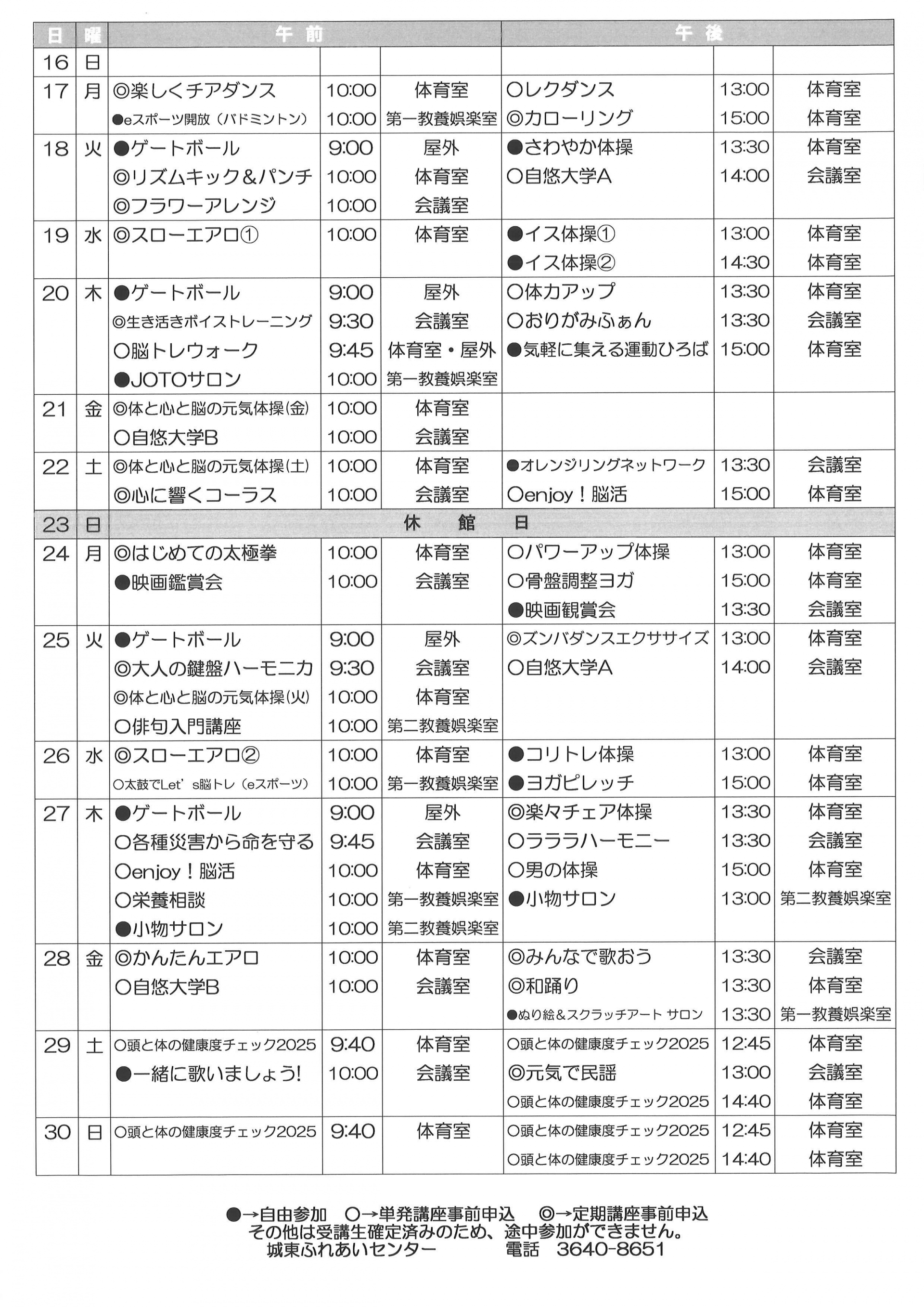 城東ふれあいセンター11月の予定表