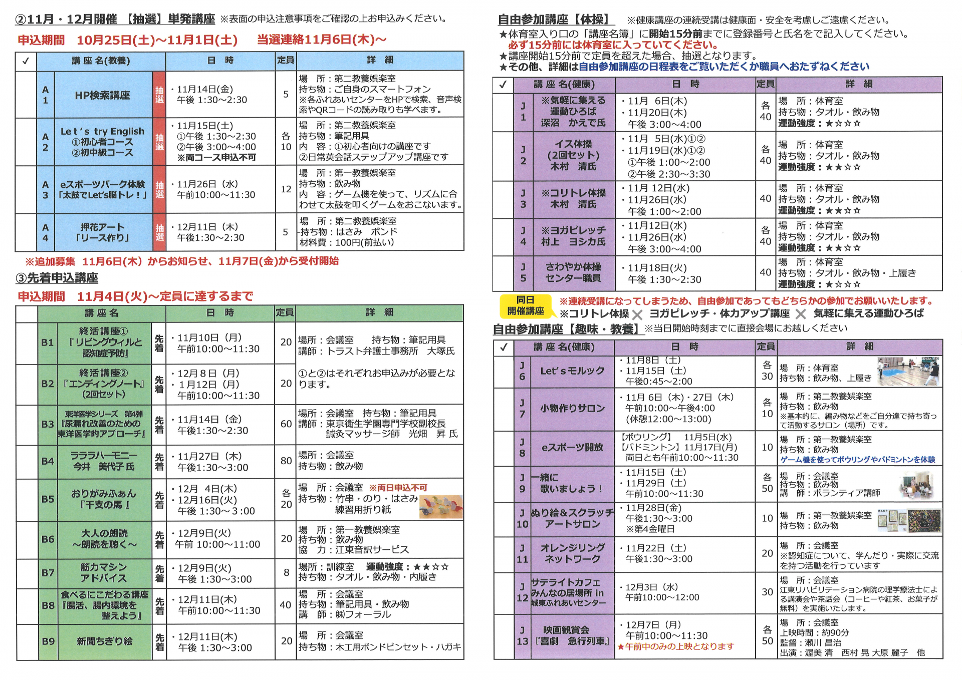 2025.10.25 お知らせ 城東ふれあいセンターのおたより11月号 Tweet シェアする 城東ふれあいセンターのおたより11月号が完成しました\(^o^)/少しずつ肌寒い日が増えてきましたね。運動と教養と・・・と館内で色々な講座に参加しませんか?今月も、講座は盛りだくさんです。皆さんのお申込をお待ちしております。 一覧へ戻る