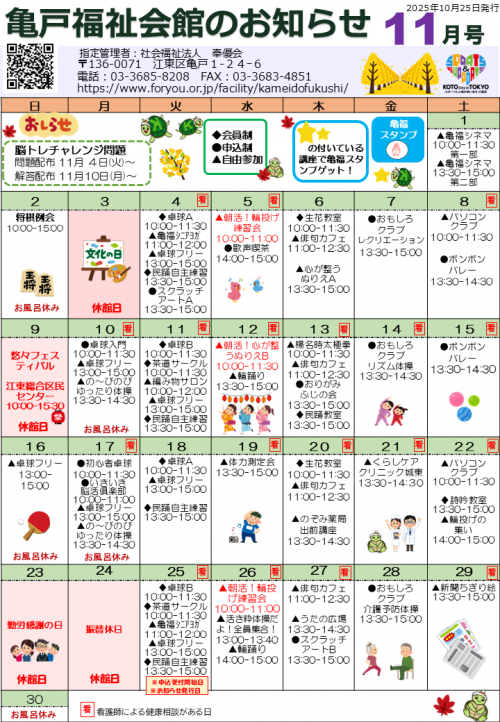 2025.11.05 NEW おもしろクラブ「音楽健康レクリエーション」が開催されました 活動報告 #亀戸福祉会館 #おもしろクラブ #音楽健康レクリエーション 2025.10.31 【健康教育教室】が開催されました 活動報告 2025.10.31 【頭と体を元気にしましょう】が開催されました 活動報告 2025.10.28 NEW!「お茶講座」開催されました!! 活動報告 #お茶 #秋山園 #亀戸福祉会館 2025.10.25 第25回悠々フェスティバルが開催されます! お知らせ #総合文化センター #悠々フェスティバル #福祉会館 2025.10.25 お知らせ11月号を発行しました! お知らせ #亀戸福祉会館 #お知らせ 2025.10.23 【いきいき脳活俱楽部】が開催されました 活動報告 2025.10.22 NEW!~「終活」はじめの一歩~が開催されました! 活動報告 #亀戸福祉会館 #終活 2025.10.18 草月流生け花教室が開催されました 活動報告 #亀戸福祉会館 #生け花教室 #秋 #芸術の秋 2025.10.15 【輪踊り】が開催されました 活動報告 2025.10.10 楊名時太極拳が開催されました 活動報告 #楊名時太極拳 #亀戸福祉会館 2025.10.10 おりがみサロンが開催されました 活動報告 #亀戸福祉会館 #おりがみサロン #おりがみ #ハロウィーン 2025.10.10 亀福シネマ【Good Dreams】 活動報告 #亀戸福祉会館 #シネマ #GoodDream #亀戸オールロケ 2025.10.10 【亀福シニアヨガ】が開催されました 活動報告 2025.10.06 【歌謡教室】が開催されました 活動報告 1 2 3 … 27