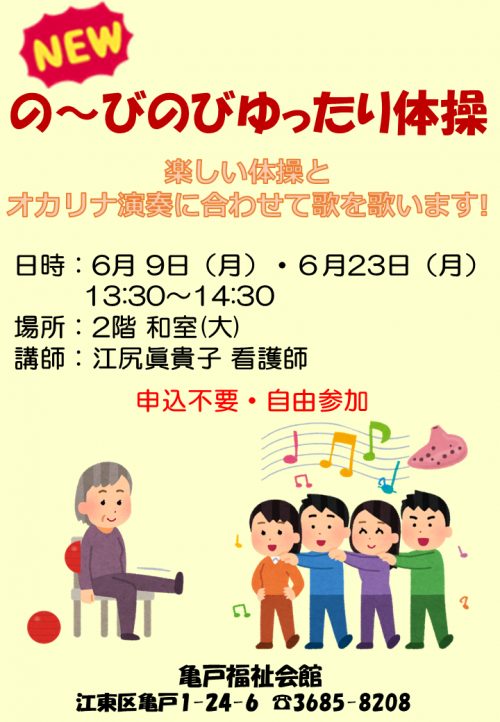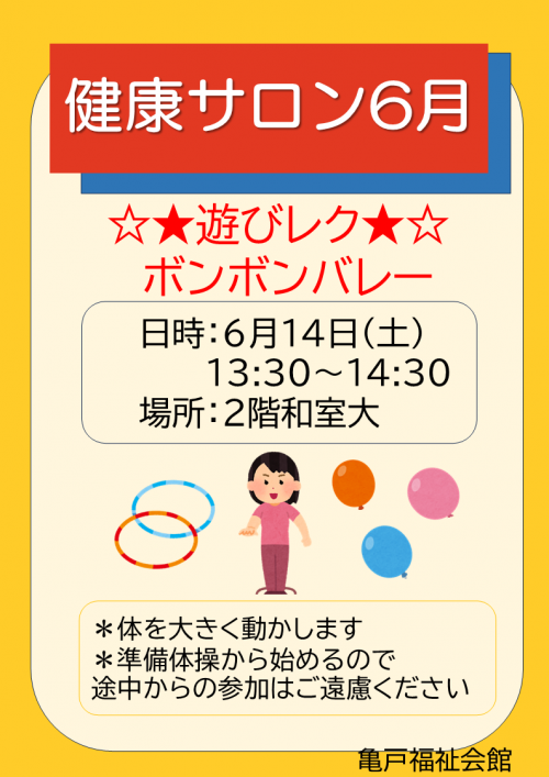 2025.10.06 『おもしろクラブ・ボイストレーニング&うた』が開催されました 活動報告 2025.10.06 【歌声喫茶】が開催されました 活動報告 2025.09.30 亀福シニアヨガが開催されました 活動報告 #亀戸福祉会館 #亀福シニアヨガ #シニアヨガ #健康講座 2025.09.30 心が整うぬりえが開催されました 活動報告 2025.09.30 【うたの広場】が開催されました 活動報告 2025.09.30 【ヘトベロ落語会】開催されました♪ 活動報告 #ヘトベロ落語会 #亀戸福祉会館 #落語 2025.09.27 『脳トレ! 健康麻雀教室(第2回)』が開催されました!! 活動報告 #亀戸福祉会館 #健康麻雀 2025.09.27 『亀福スマイルフェア』開催のお知らせ お知らせ #亀戸福祉会館 #お祭り #スマイルフェア 2025.09.25 お知らせ10月号を発行しました! お知らせ #亀戸福祉会館 #お知らせ 2025.09.24 草月流生け花教室が開催されました 活動報告 #草月流生け花教室 #亀戸福祉会館 #生花教室 #ひまわり 2025.09.22 いきいき脳活俱楽部が開催されました 活動報告 #亀戸福祉会館 #いきいき脳活俱楽部 #健康体操 2025.09.22 朝活!輪投げ練習会開催しました♪ 活動報告 #亀戸福祉会館 #輪投げ 2025.09.22 【おもしろクラブ・レクリエーション】が開催されました 活動報告 2025.09.22 亀戸一丁目町会・亀戸福祉会館合同映画観賞会のお知らせ 活動報告 #亀戸福祉会館 #シネマ 2025.09.20 のぞみ薬局出前講座が開催されました 活動報告 #亀戸福祉会館 #のぞみ薬局 #アロマ #石鹼作り 1 2 3 4 5 6 … 29