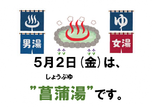 2025.12.09 今月の冬至 "ゆず湯" のお知らせ お知らせ #江東区 #亀戸福祉会館 #お風呂 #ゆず湯 2025.04.29 ♨♨♨"菖蒲湯"♨♨♨のご案内 お知らせ #江東区 #亀戸 #福祉 #お風呂
