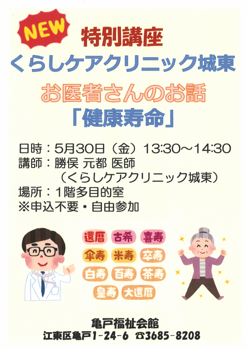 2025.11.25 お医者さんの話し「もしもの時も安心!訪問診療ってどんな事ができる?」が開催されました! 活動報告 #亀戸福祉会館 #くらしケアクリニック城東 #訪問診療 2025.08.30 くらしケアクリニック城東 お医者さんの話「認知症について」が開催されました! 活動報告 #亀戸福祉会館 #くらしケアクリニック城東 #お医者さんの話 #認知症について 2025.05.31 NEW!くらしケアクリニックお医者さんのお話「健康寿命」が開催されました! 活動報告 #亀戸福祉会館 #くらしケアクリニック城東 #フレイル予防 #たんぱく質 #健康寿命