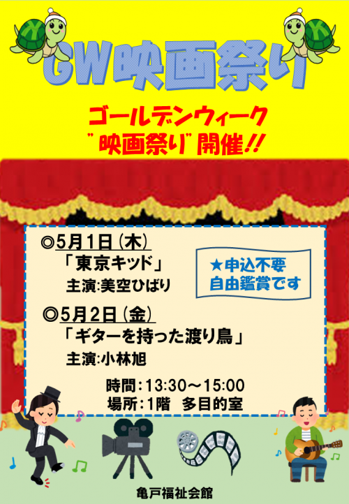 2025.12.02 好評「亀福シネマ」12月上映タイトルのご案内 お知らせ #江東区 #亀戸福祉会館 #シネマ 2025.10.10 亀福シネマ【Good Dreams】 活動報告 #亀戸福祉会館 #シネマ #GoodDream #亀戸オールロケ 2025.09.22 亀戸一丁目町会・亀戸福祉会館合同映画観賞会のお知らせ 活動報告 #亀戸福祉会館 #シネマ 2025.04.29 ✨ゴールデンウィーク映画まつり開催✨ 活動報告 #江東区 #亀戸 #福祉 #シネマ