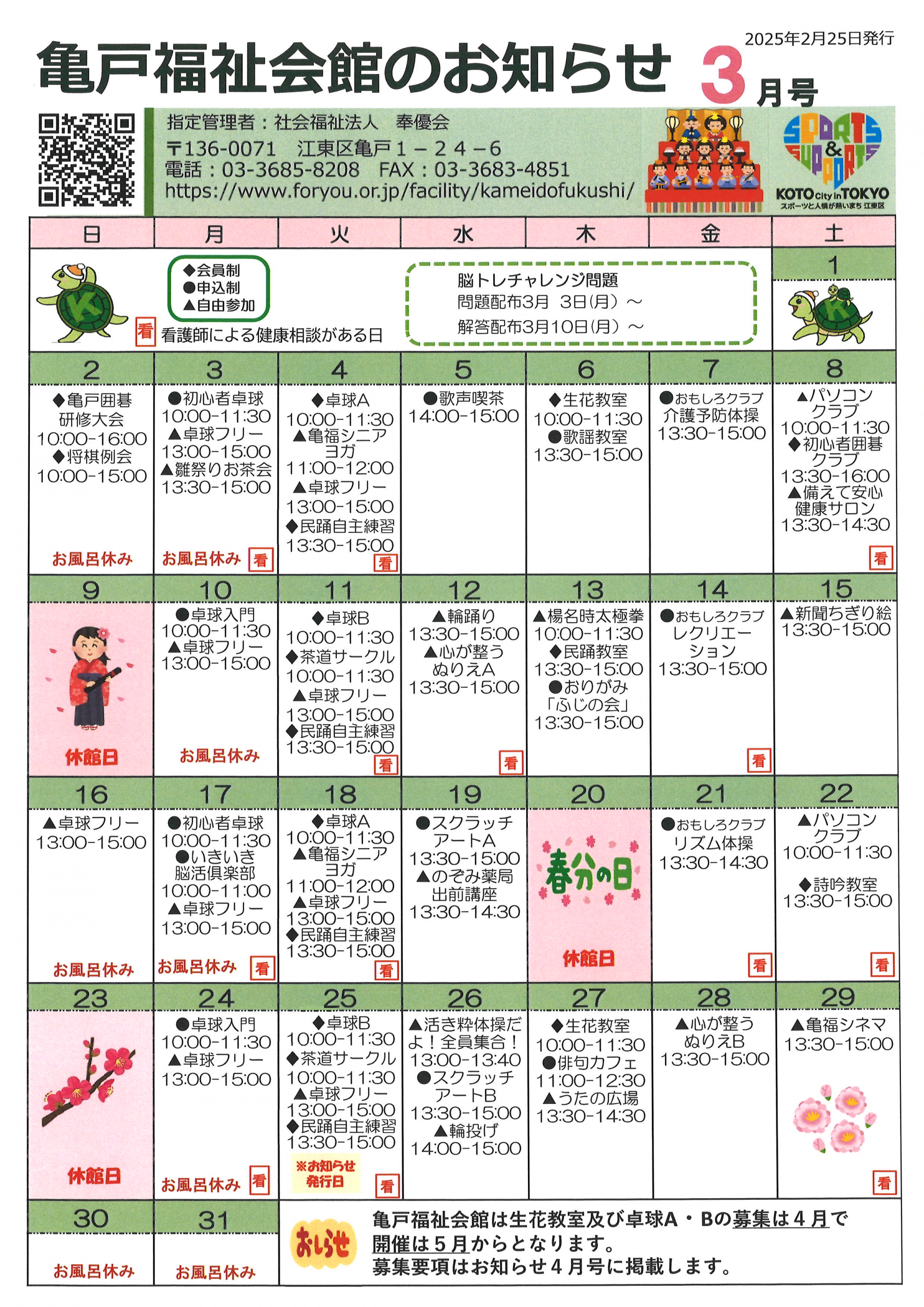 2025.02.25 お知らせ お知らせ3月号を発行しました。 Tweet シェアする 前の記事 2025.02.25 お知らせ "雛祭りお茶会"開催のお知らせ 次の記事 2025.02.22 お知らせ 「歌声喫茶」が開催されました 一覧へ戻る