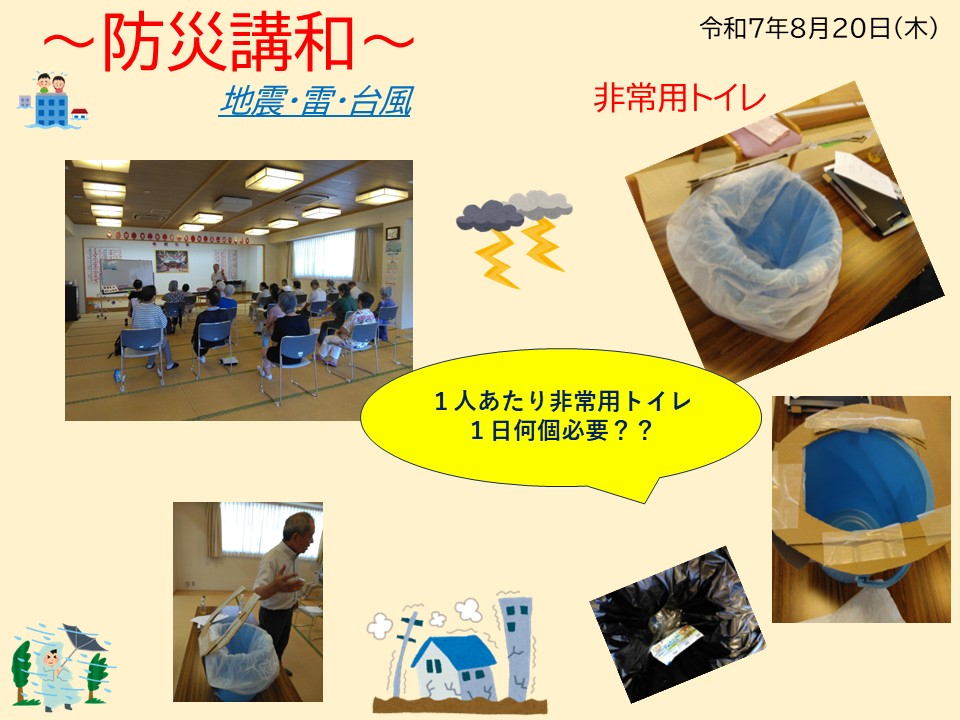 令和7年度【防災講和】開催されました!今回は「地震・雷・台風」のお話しでした。災害は忘れたころにやってくると言いますが・・・ここ数年水害や地震など様々な災害があちこちで起きています。いつ起きてもおかしくない災害、起きた時どのように行動するとよいか?防災グッズは準備しているか?などなど防災防火危機管理アドバイザーの山崎正雄氏にお話しいただきました!