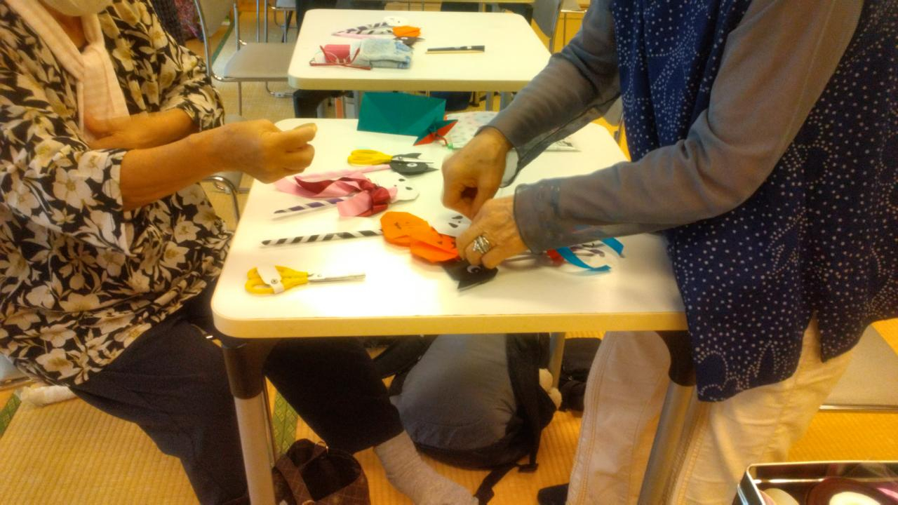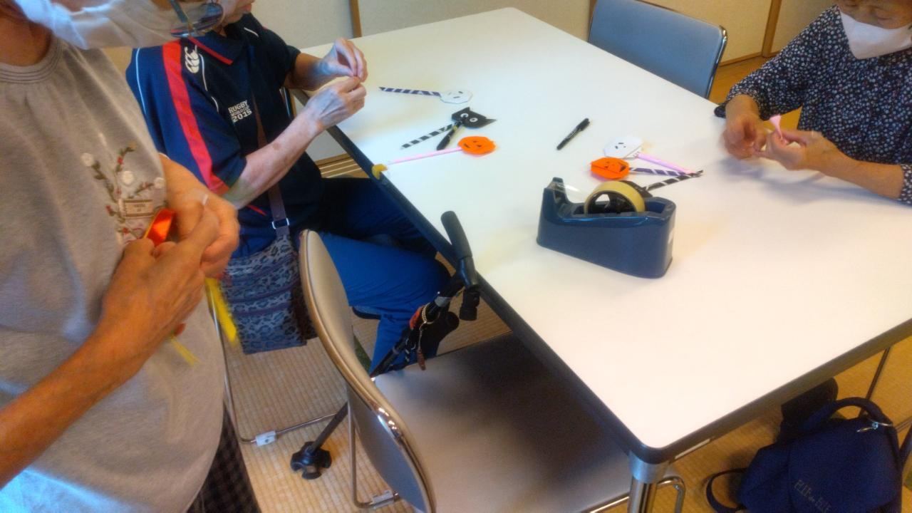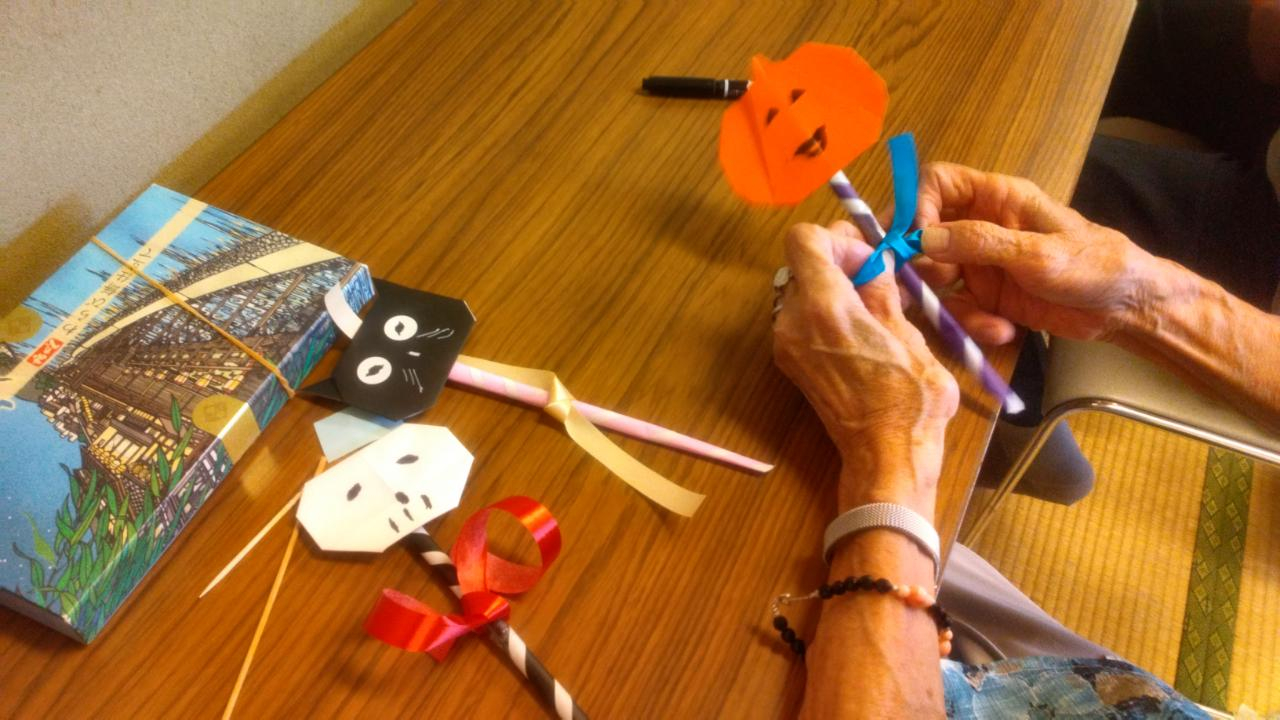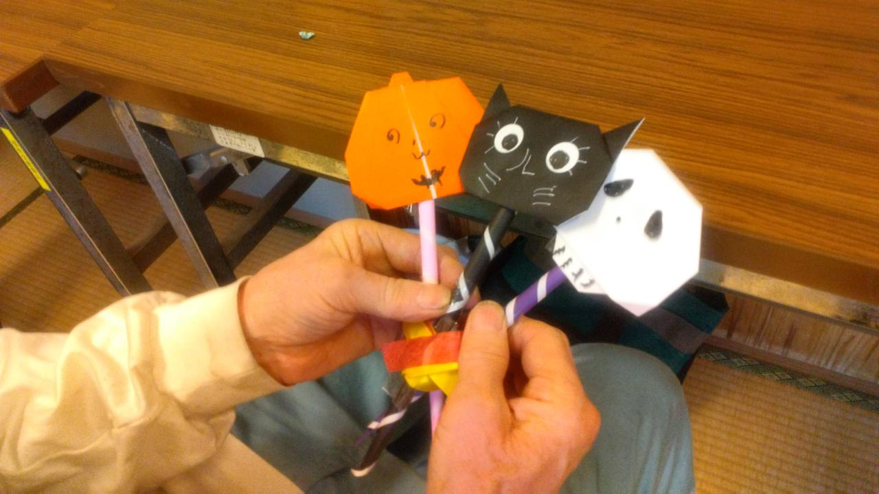 かぼちゃ、黒ネコ、ドクロの3種類を折ってしましまのスティックもストローではなく、おりがみで作りました。