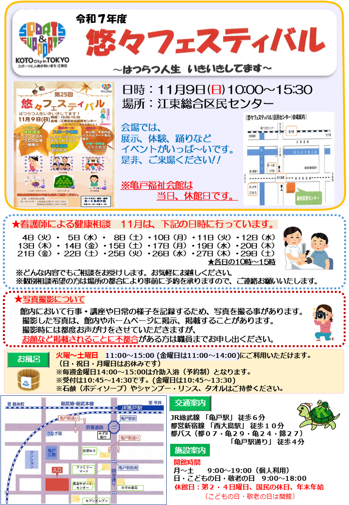 2025.10.25 お知らせ お知らせ11月号を発行しました! Tweet シェアする #亀戸福祉会館 #お知らせ 前の記事 2025.10.25 お知らせ 第25回悠々フェスティバルが開催されます! 次の記事 2025.10.23 お知らせ 【いきいき脳活俱楽部】が開催されました 一覧へ戻る