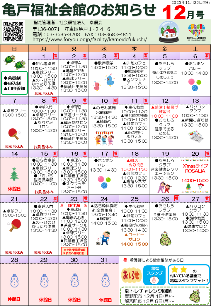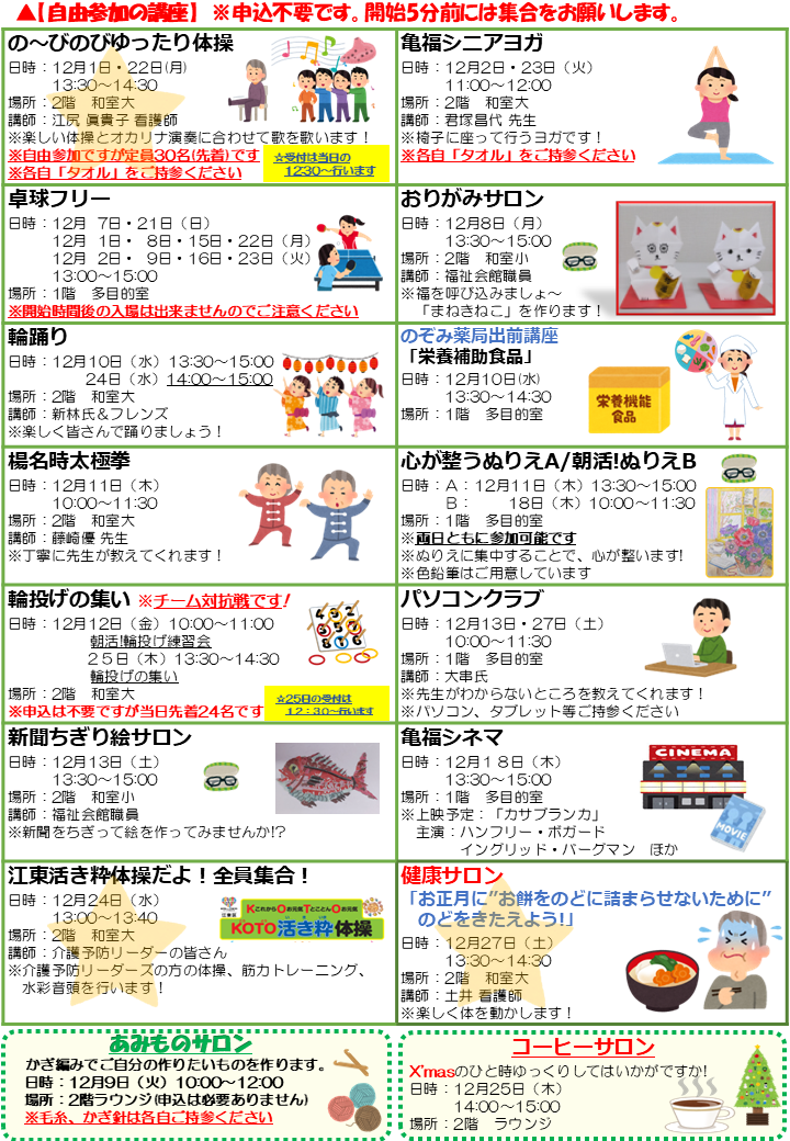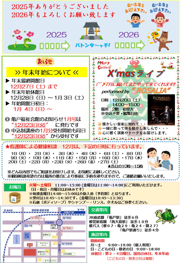 2025.11.25 お知らせ お知らせ12月号を発行しました! Tweet シェアする #亀戸福祉会館 #12月お知らせ 前の記事 2025.11.25 お知らせ お医者さんの話し「もしもの時も安心!訪問診療ってどんな事ができる?」が開催されました! 次の記事 2025.11.21 お知らせ のぞみ薬局出前講座「感染症について」が開催されました 一覧へ戻る