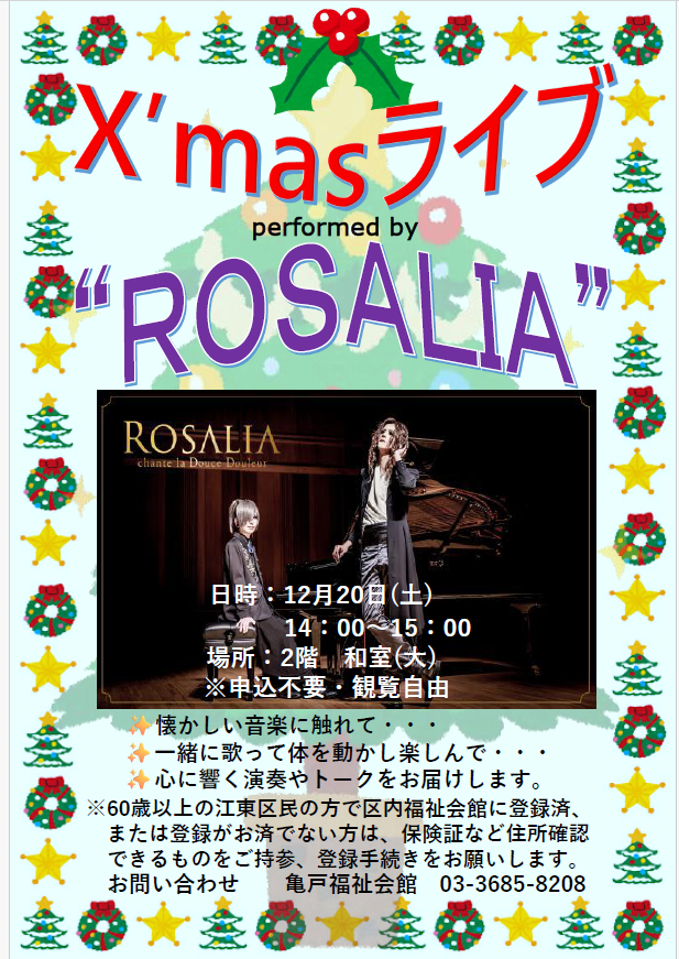 2025.11.29 お知らせ X’mas ライブ ROSALIA Tweet シェアする また会いたい!また聞きたい!また呼んで~♪ と大変多くの声をいただきました! お待たせしました!みんなで一緒に盛り上がりましょう~♪ 亀戸福祉会館 前の記事 2025.12.01 お知らせ 介護予防体操が開催されました。 次の記事 2025.11.25 お知らせ 『体力測定会』を実施しました 一覧へ戻る