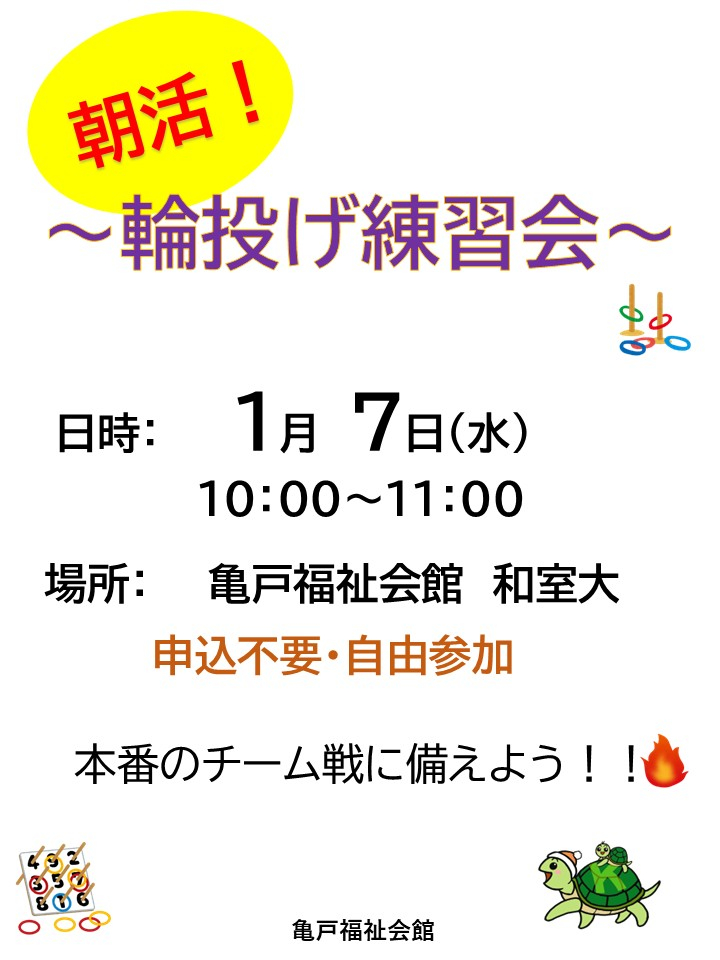 2026.01.05 活動報告 朝活!~輪投げ練習会~開催します♪ Tweet シェアする 令和8年1月7日(水)10:00~11:00 朝活!~輪投げ練習会~ 開催します(^^)/令和8年輪投げ始めしましょ~~~~~♪職員一同お待ちしております♪亀戸福祉会館 M.K #亀戸福祉会館 #輪投げ #練習会 前の記事 2026.01.05 活動報告 🌷『生花展覧会』開催のお知らせ 次の記事 2026.01.04 活動報告 輪投げの集い開催しました♪ 一覧へ戻る