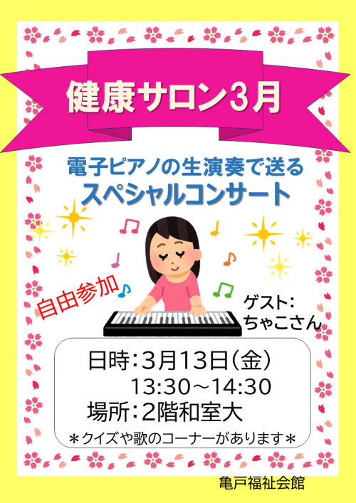 2026.03.04 NEW お知らせ K.Wave'12 ウクレレコンサート開催のお知らせ Tweet シェアする またまたやってきます。"K.Wave'12"の皆さん。色々な楽曲を素敵なウクレレの演奏で楽しんでみてはいかがですか! 亀戸福祉会館 Y.H 前の記事 2026.03.04 お知らせ 今月の「健康サロン(スペシャルコンサート)」のご紹介 次の記事 2026.03.02 お知らせ 城東警察署主催の「交通安全講話(自転車交通反則通告制度)」のご紹介 一覧へ戻る