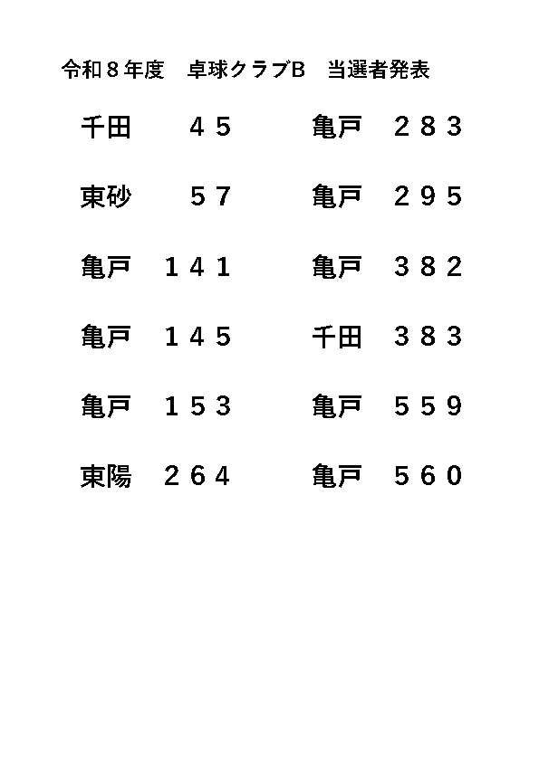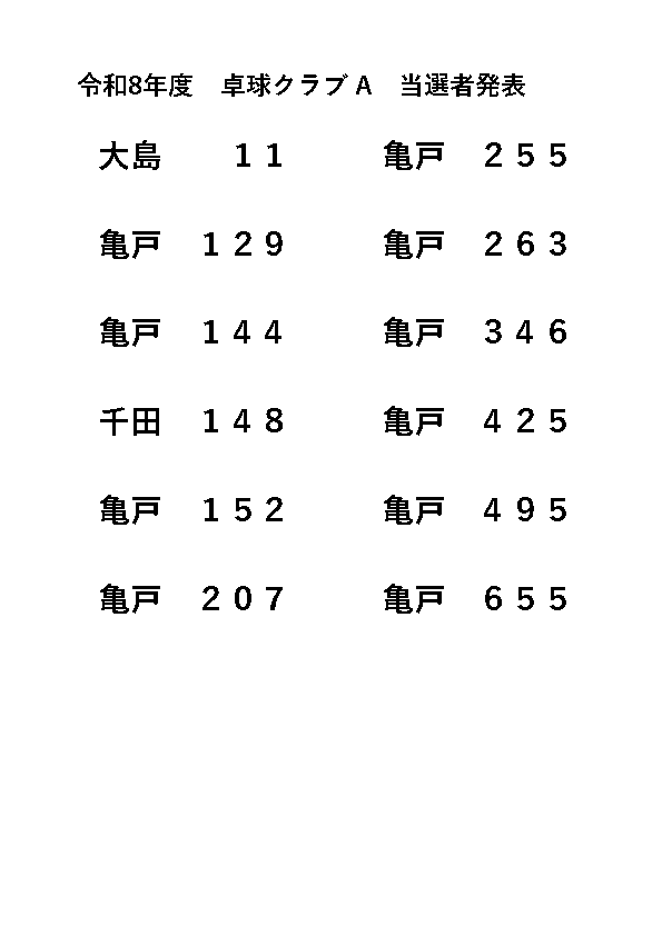 2026.04.20 お知らせ ~令和8年度卓球クラブAB当選者発表~ Tweet シェアする ~令和8年度 卓球クラブAB当選者発表~卓球クラブA当選者卓球クラブB当選者事務所にて年間予定表をご用意していますので、職員に声をおかけください。亀戸福祉会館 M.K #亀戸福祉会館 #卓球クラブAB当選発表 #卓球当選発表 前の記事 2026.04.21 お知らせ 亀福ベランダ菜園・春 次の記事 2026.04.20 お知らせ ~令和8年度・生花教室・当選者発表~ 一覧へ戻る