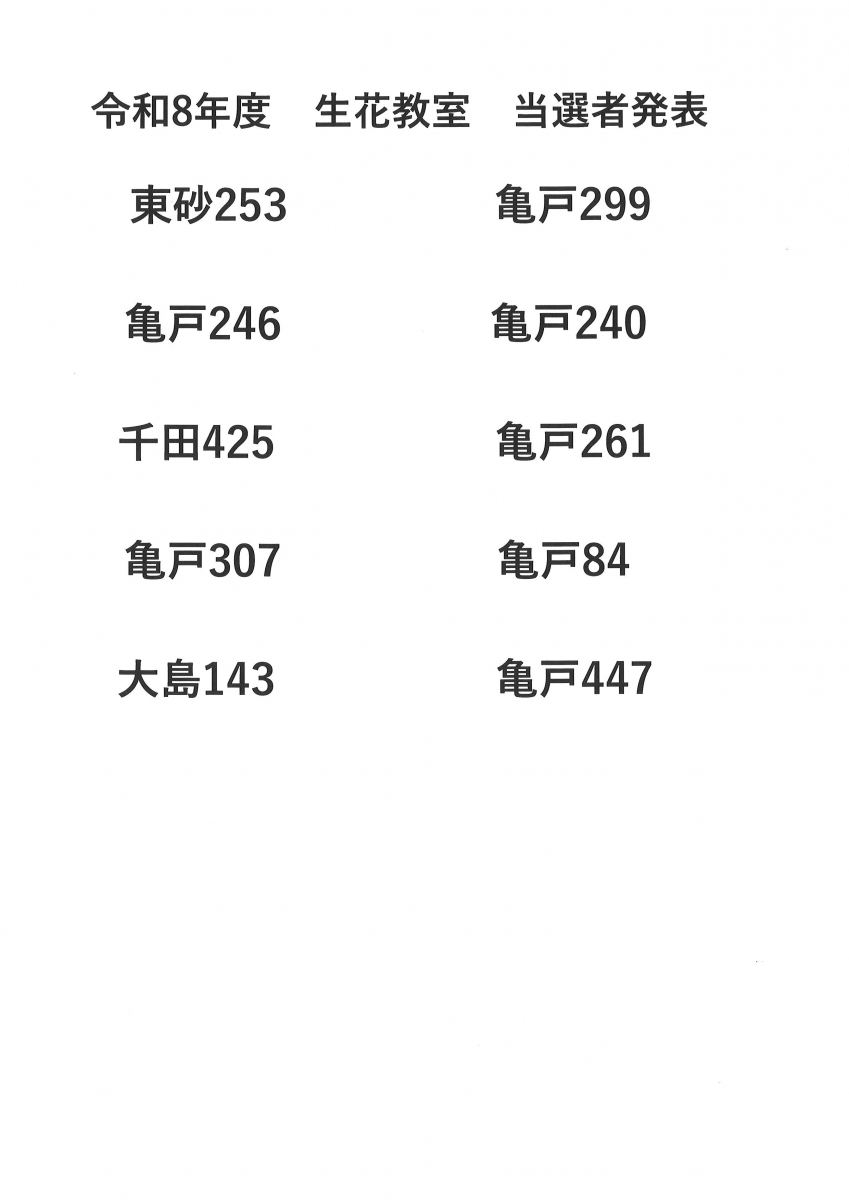 2026.04.20 お知らせ ~令和8年度・生花教室・当選者発表~ Tweet シェアする 令和8年度の草月流生花教室当選者発表です。 事務所にて年間予定表をご用意していますので、職員に声をおかけください。 亀戸福祉会館A.M 前の記事 2026.04.20 お知らせ ~令和8年度卓球クラブAB当選者発表~ 次の記事 2026.04.16 お知らせ のぞみ薬局出前講座 一覧へ戻る