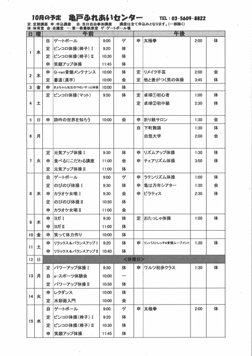 2025.10.03 祝!!ドリかめ手帳100個達成 活動報告 2025.10.02 やさしいウクレレ教室の最終回が行われました。 活動報告 2025.09.25 10月自由参加日程表【ゆうゆう体操、カラオケ自由開放、卓球自由開放】 お知らせ 2025.09.25 2025年亀戸ふれあいセンター10月号予定表 お知らせ 2025.09.25 2025年亀戸ふれあいセンター10月号おたより お知らせ 2025.09.24 楽しモルック 開催しました! 活動報告 2025.09.22 10月前半毎回申込講座・3ヶ月講座 追加募集のご案内 お知らせ 2025.09.22 10月前半毎回申込講座 当選連絡その2【その他の講座】【3ヶ月講座】 お知らせ 2025.09.22 10月前半開催の毎回申込み講座の当選発表 お知らせ 2025.09.20 9月はアルツハイマー月間です。 活動報告 2025.09.19 祝!ドリかめスタンプ700個達成☆ 活動報告 2025.09.18 白熱しました!【4館合同eスポーツ大会】 活動報告 2025.09.15 祝‼ドリかめ手帳1200個達成 活動報告 2025.09.13 R7年秋の定期講座の追加募集 活動報告 2025.09.11 令和7年度 秋の定期講座(10月~R8.3月)の当選連絡のお知らせ お知らせ 1 2 3 … 44
