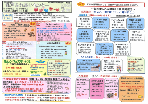 2026.01.26 カレンダー配布のご案内 お知らせ 2026.01.26 2月自由参加日程表【ゆうゆう体操、カラオケ自由開放、卓球自由開放】 活動報告 2026.01.25 募集開始しました♬ 『チョコレートの世界へようこそ』 を開催しま~す お知らせ 2026.01.24 2026年亀戸ふれあいセンター2月号予定表 お知らせ 2026.01.24 2026年亀戸ふれあいセンター2月号おたより お知らせ 2026.01.23 2月前半毎回申込講座 追加募集のご案内 お知らせ 2026.01.23 2月前半毎回申込講座 当選連絡その2【その他の講座】 お知らせ 2026.01.23 2月前半開催の毎回申込み講座の当選発表 お知らせ 2026.01.22 祝ドリかめ手帳700個達成 活動報告 2026.01.22 祝!!ドリかめスタンプ1300個達成!!! 活動報告 2026.01.21 折り紙でポチ袋折りました(^^) 活動報告 2026.01.16 祝‼ドリかめ手帳300個達成☆ 活動報告 2026.01.15 詩吟発表会♪【詩吟の世界を知ろう】 活動報告 2026.01.14 ドリかめスタンプ900個達成者のご紹介 活動報告 2026.01.14 祝‼ドリかめ手帳700個達成~☆彡 活動報告 1 2 3 … 49