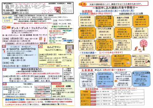 2026.03.11 R8年 春の定期講座の追加募集 お知らせ 2026.03.10 令和8年度 春の定期講座(4月~9月)の当選連絡のお知らせ お知らせ 2026.03.07 3月後半毎回申込講座 追加募集のご案内 お知らせ 2026.03.07 3月後半毎回申込講座 当選連絡その2【その他の講座】 活動報告 2026.03.07 3月後半開催の毎回申込み講座の当選発表 活動報告 2026.03.05 春の定期講座、大抽選中!! お知らせ 2026.03.05 楽しい簡単スィーツ作り♬ 活動報告 2026.02.25 2026年亀戸ふれあいセンター3月号予定表 お知らせ 2026.02.25 2026年亀戸ふれあいセンター3月号おたより お知らせ 2026.02.25 3月自由参加日程表【ゆうゆう体操、カラオケ自由開放、卓球自由開放】 お知らせ 2026.02.23 3月前半毎回申込講座 追加募集のご案内 お知らせ 2026.02.23 3月前半毎回申込講座 当選連絡その2【その他の講座】 お知らせ 2026.02.23 3月前半開催の毎回申込み講座の当選発表 お知らせ 2026.02.21 祝ドリかめ手帳100個達成!! 活動報告 2026.02.21 折り紙サロン『ハート💛のリース』を折りました 活動報告 1 2 3 … 51