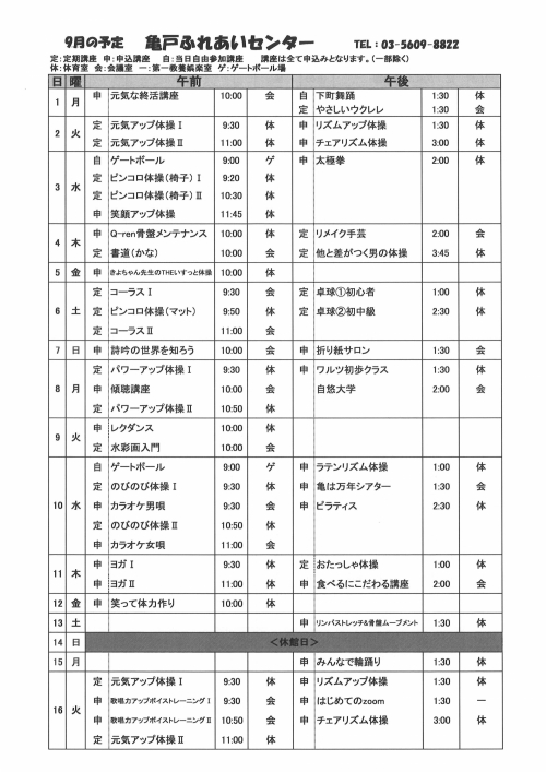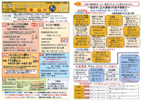 2025.09.15 祝‼ドリかめ手帳1200個達成 活動報告 2025.09.13 R7年秋の定期講座の追加募集 活動報告 2025.09.11 令和7年度 秋の定期講座(10月~R8.3月)の当選連絡のお知らせ お知らせ 2025.09.09 祝‼ドリかめ手帳700個達成 活動報告 2025.09.08 令和7年度秋の定期講座、公開抽選をおこないました お知らせ 2025.09.05 9月後半毎回申込講座 追加募集のご案内 お知らせ 2025.09.05 9月後半開催の毎回申込み講座の当選発表その2【その他の講座】 お知らせ 2025.09.05 9月後半開催の毎回申込み講座の当選発表 お知らせ 2025.09.04 ~あなたの喉の老化は大丈夫?~喉のリハビリ講座を開催いたしました! 活動報告 2025.09.01 ハンドメイドサロン・かわいいチャームがたくさんできました~♬ 活動報告 2025.08.25 【折り紙サロン】ゆらゆら揺れる♪きんぎょを作りました~!! 活動報告 2025.08.25 9月自由参加日程表【ゆうゆう体操、カラオケ自由開放、卓球自由開放】 お知らせ 2025.08.25 2025年亀戸ふれあいセンター9月号予定表 お知らせ 2025.08.25 2025年亀戸ふれあいセンター9月号おたより お知らせ 2025.08.22 9月前半毎回申込講座 追加募集のご案内 お知らせ 1 2 3 4 … 44