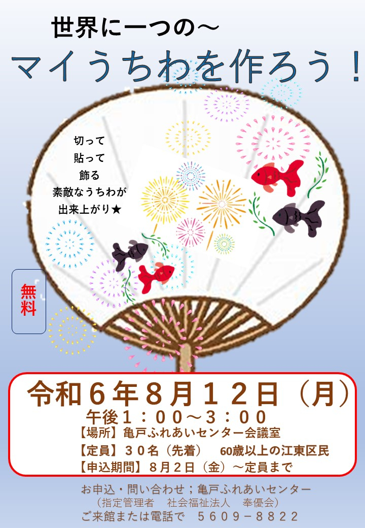先着30名となりますので、興味がある方はお早めに亀戸ふれあいセンター窓口かお電話にてお申込みください。