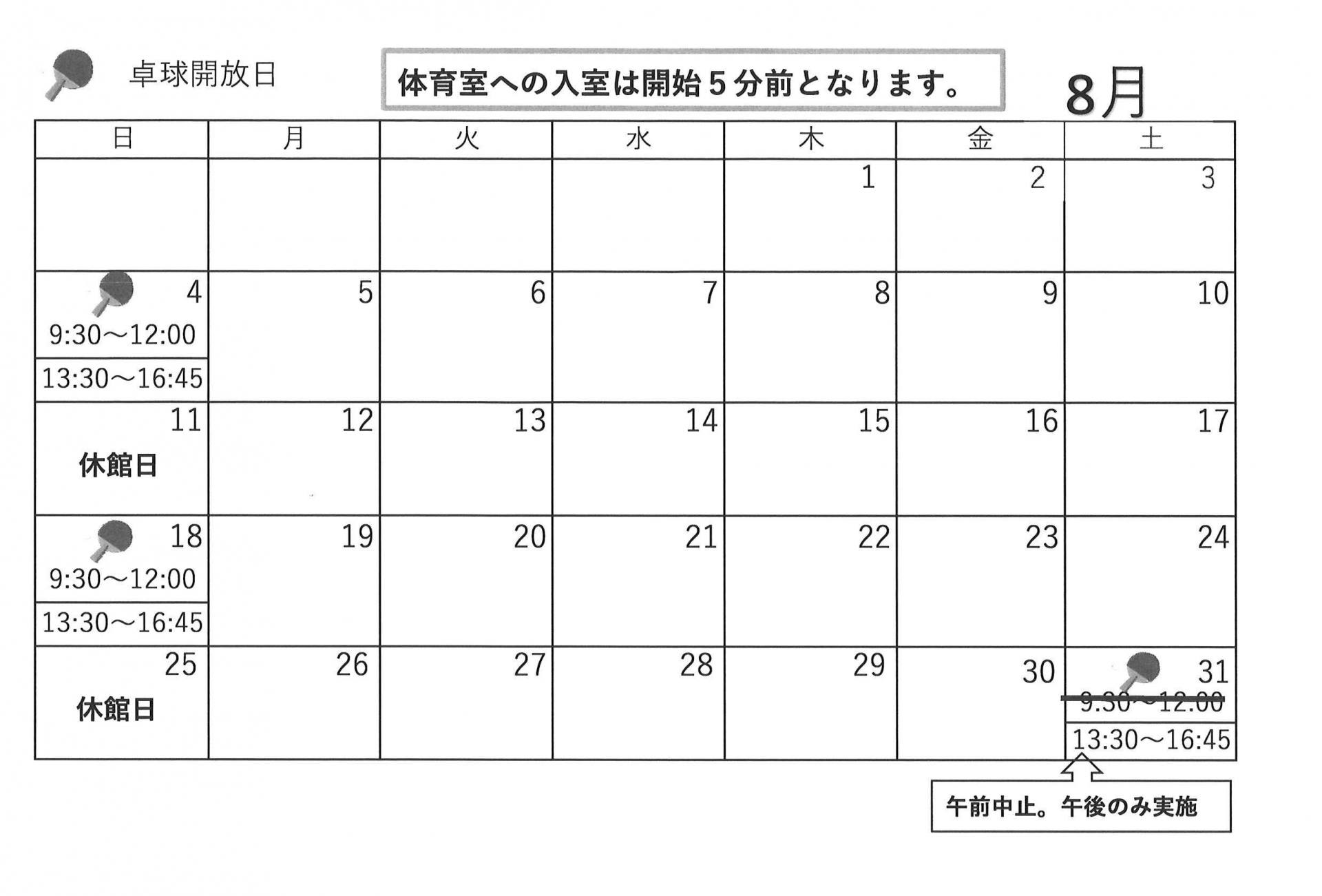 7月25日に掲載しております、8月自由参加【卓球自由開放日】について一部変更がございますので、改めて掲載させていただきます。