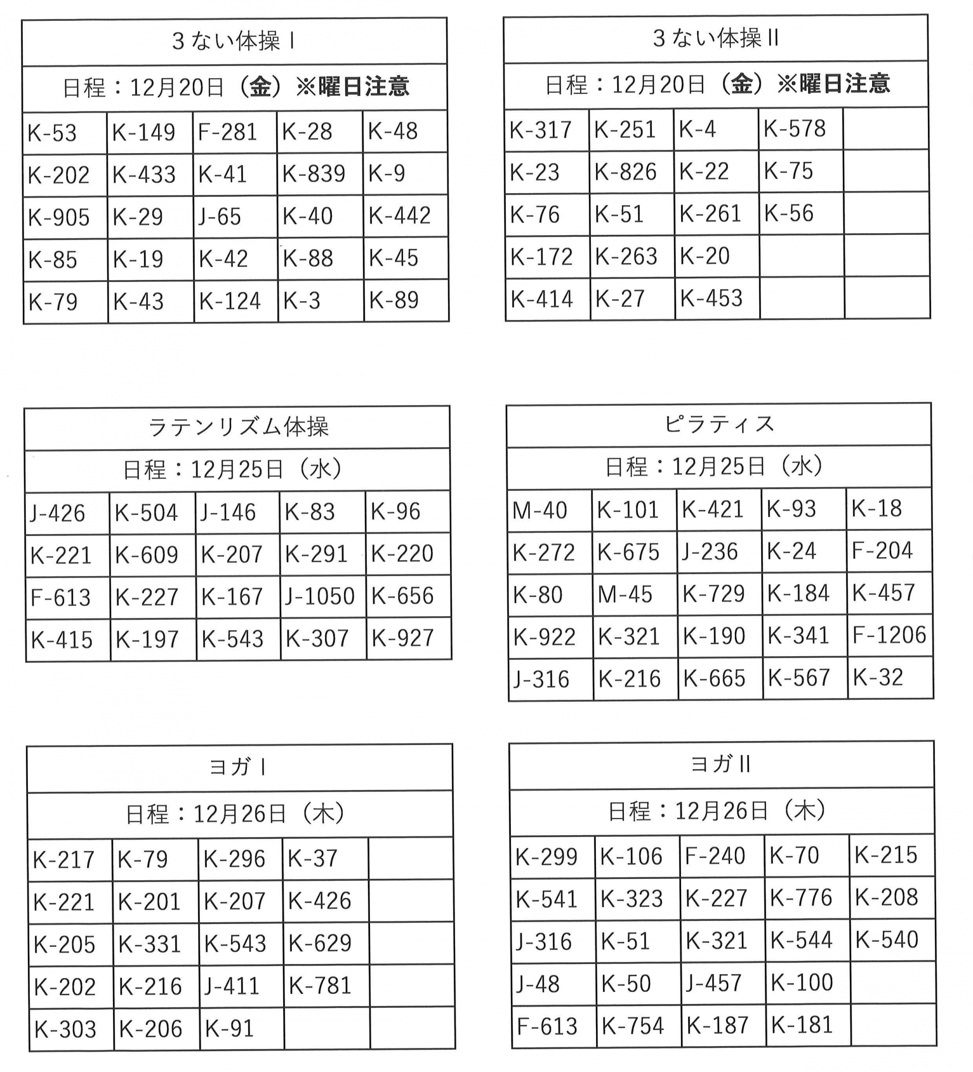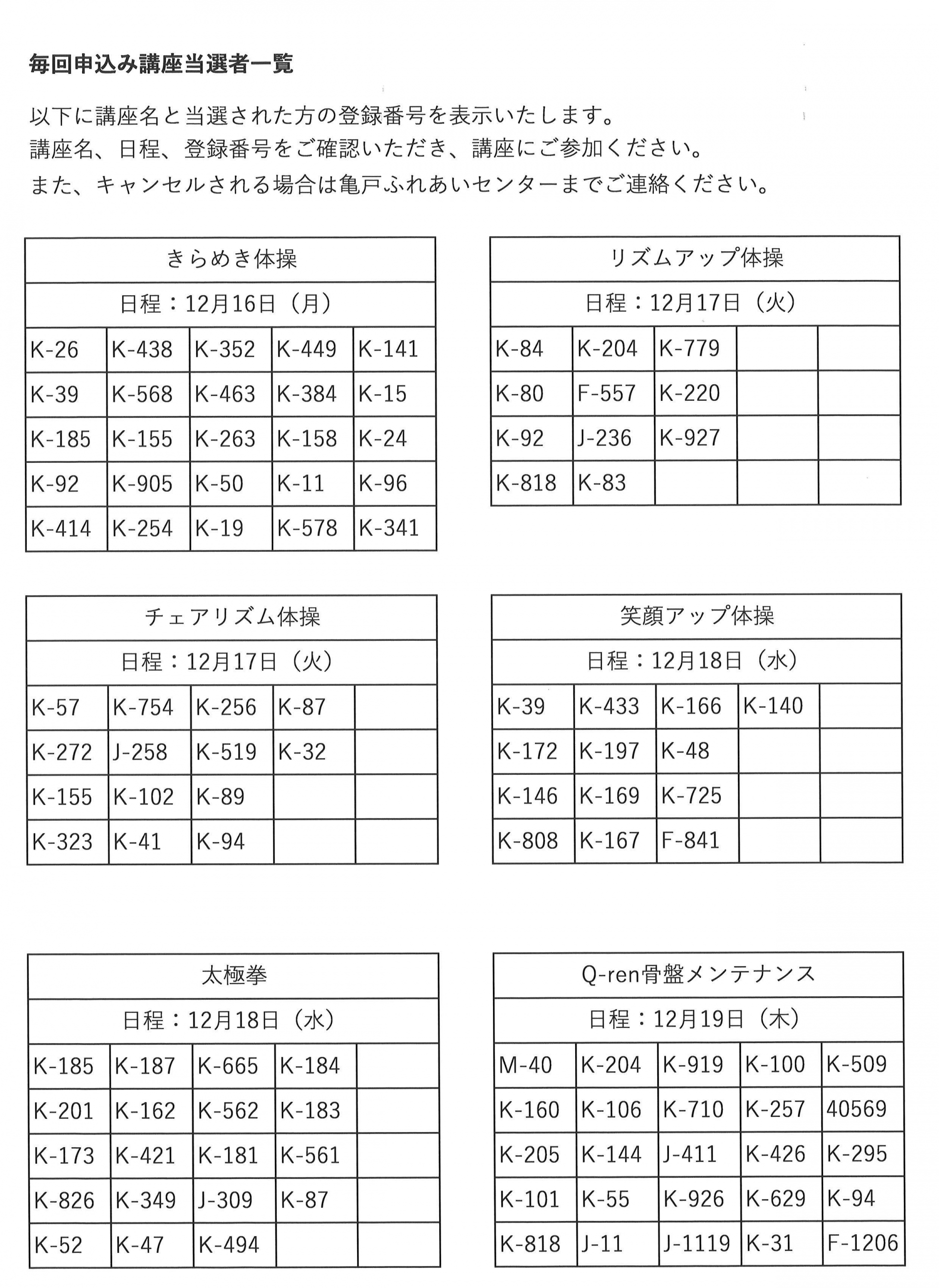 12月後半開催毎回申込講座 当選連絡その1【体操講座】