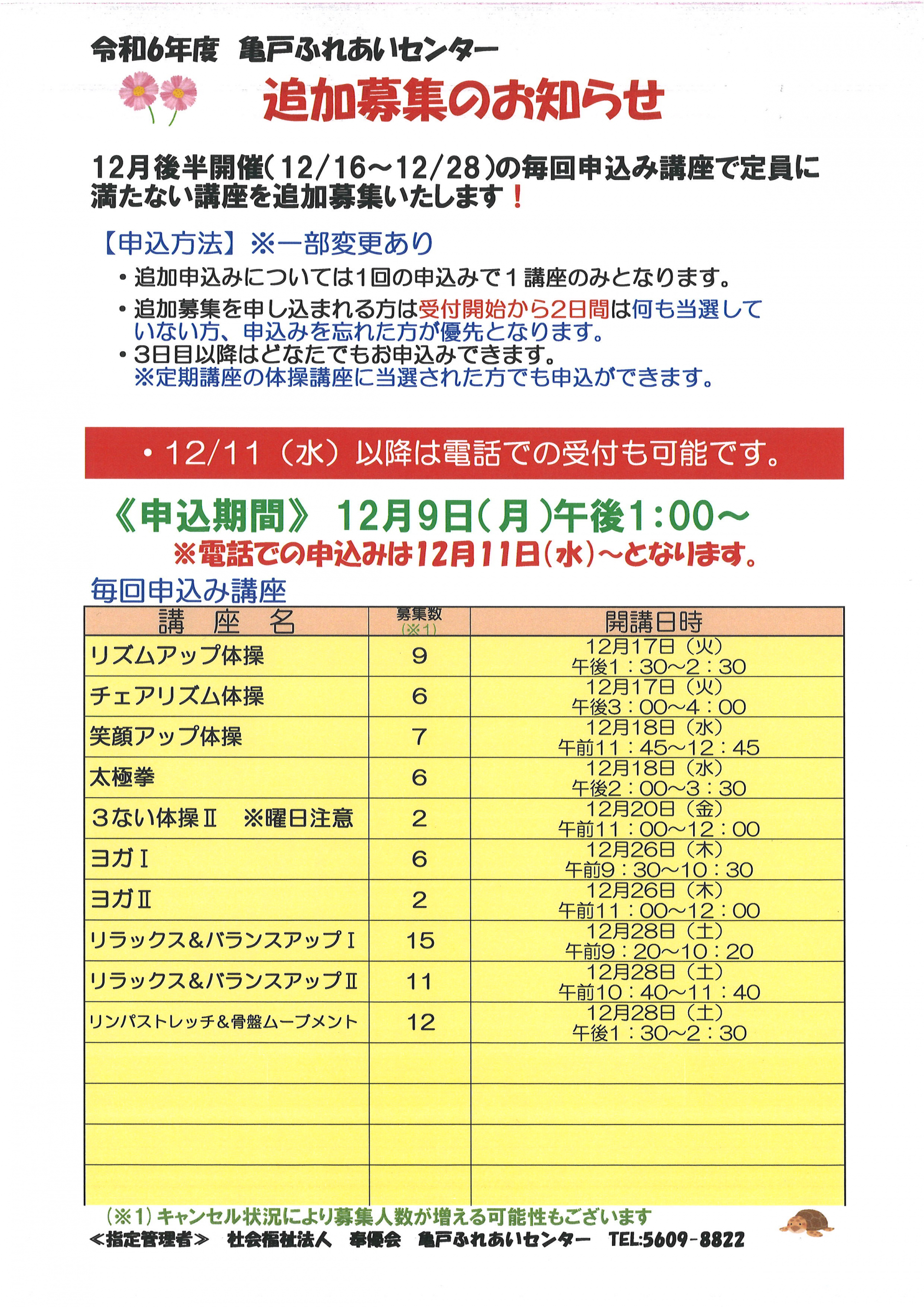 12月後半開催の毎回申込講座で定員に満たなかった講座の追加募集を行います。追加募集する講座は以下の講座になります。