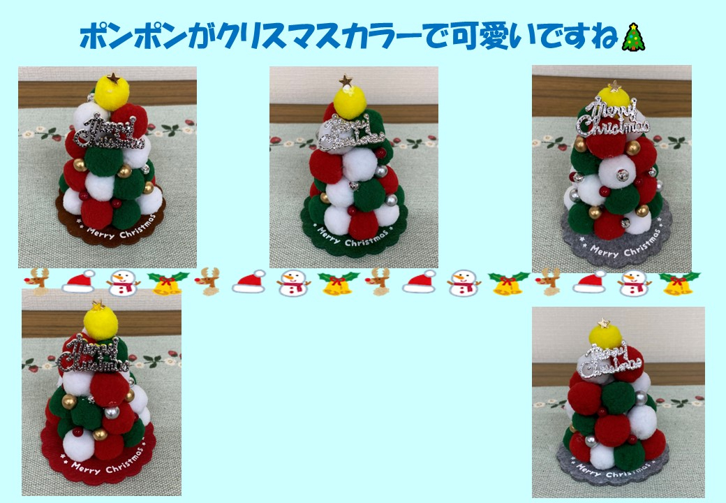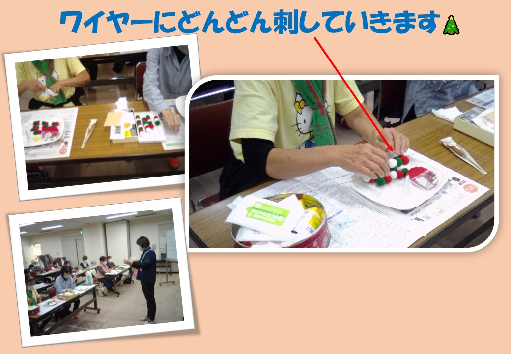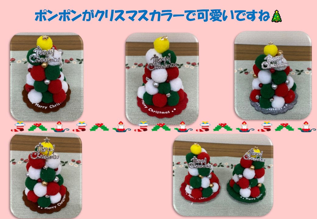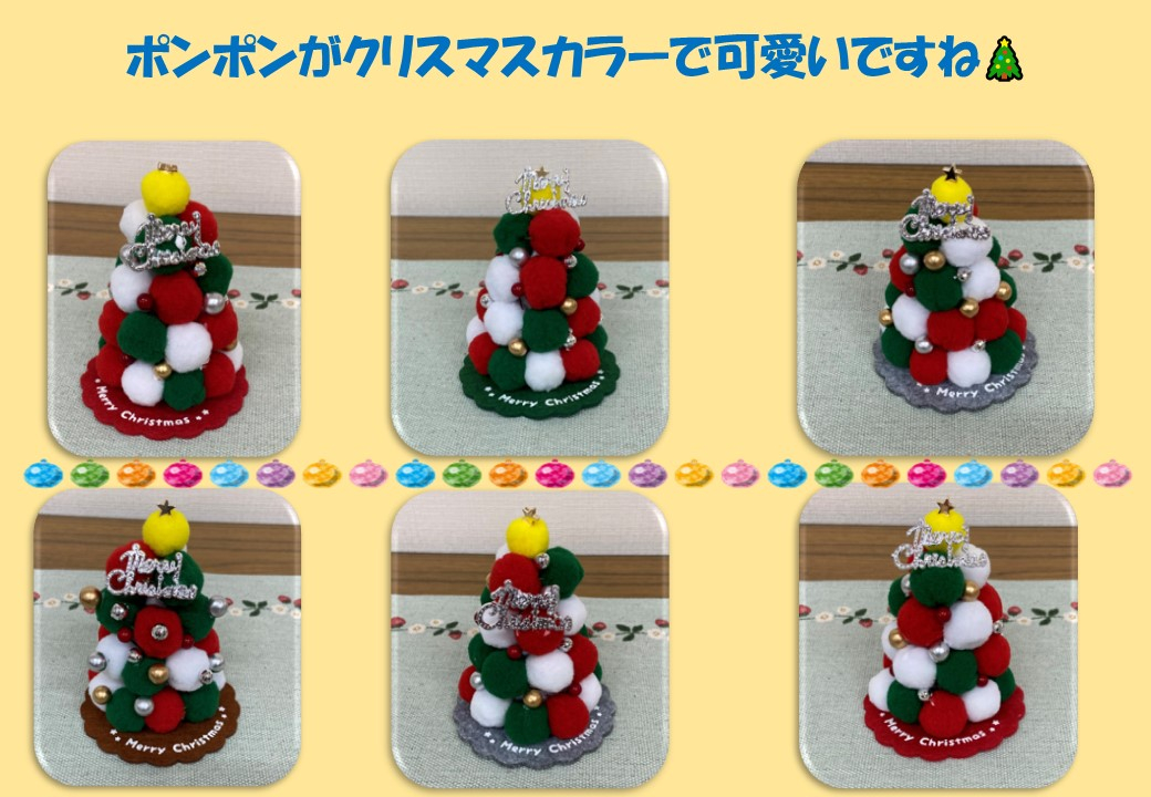 参加者の皆様にも一足早くクリスマス気分を味わっていただこうと、今回はポンポンを使い見た目も可愛いツリーを作っていただきました。