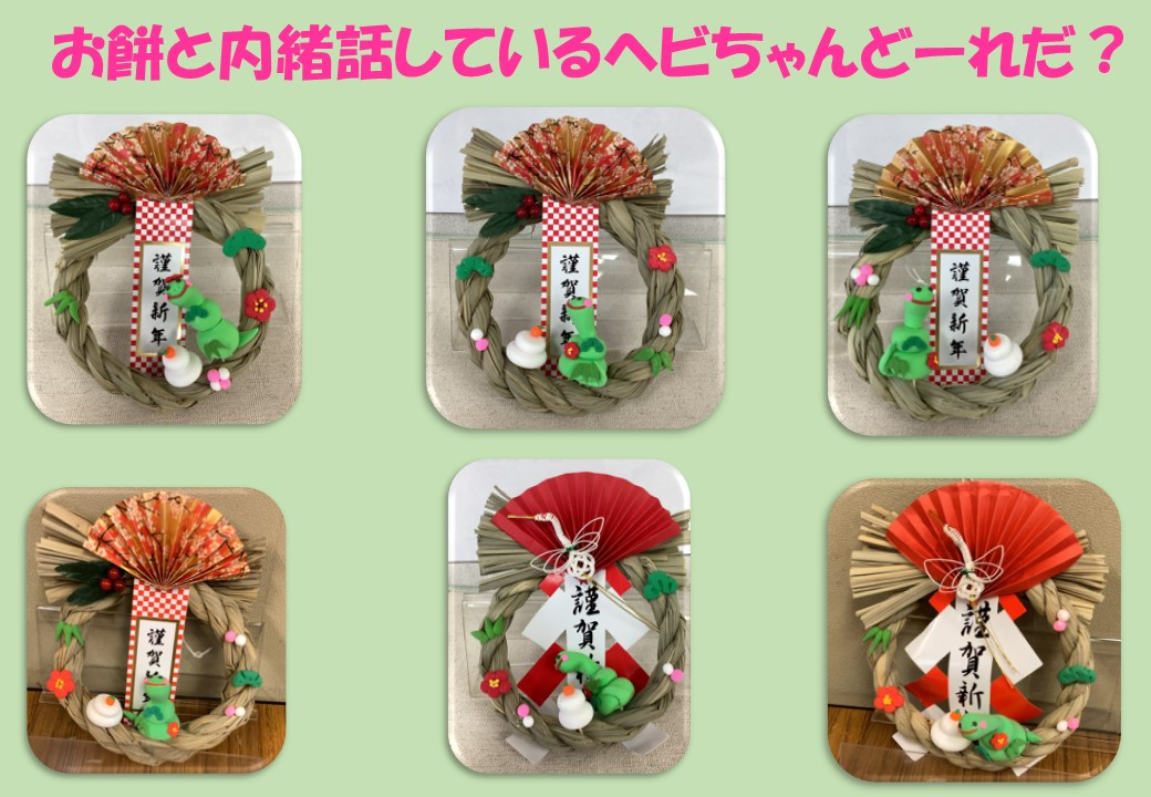 来年は巳年、かわいいヘビちゃんと鏡餅、そして松竹梅の飾りを作りしめ縄に飾って完成となります。