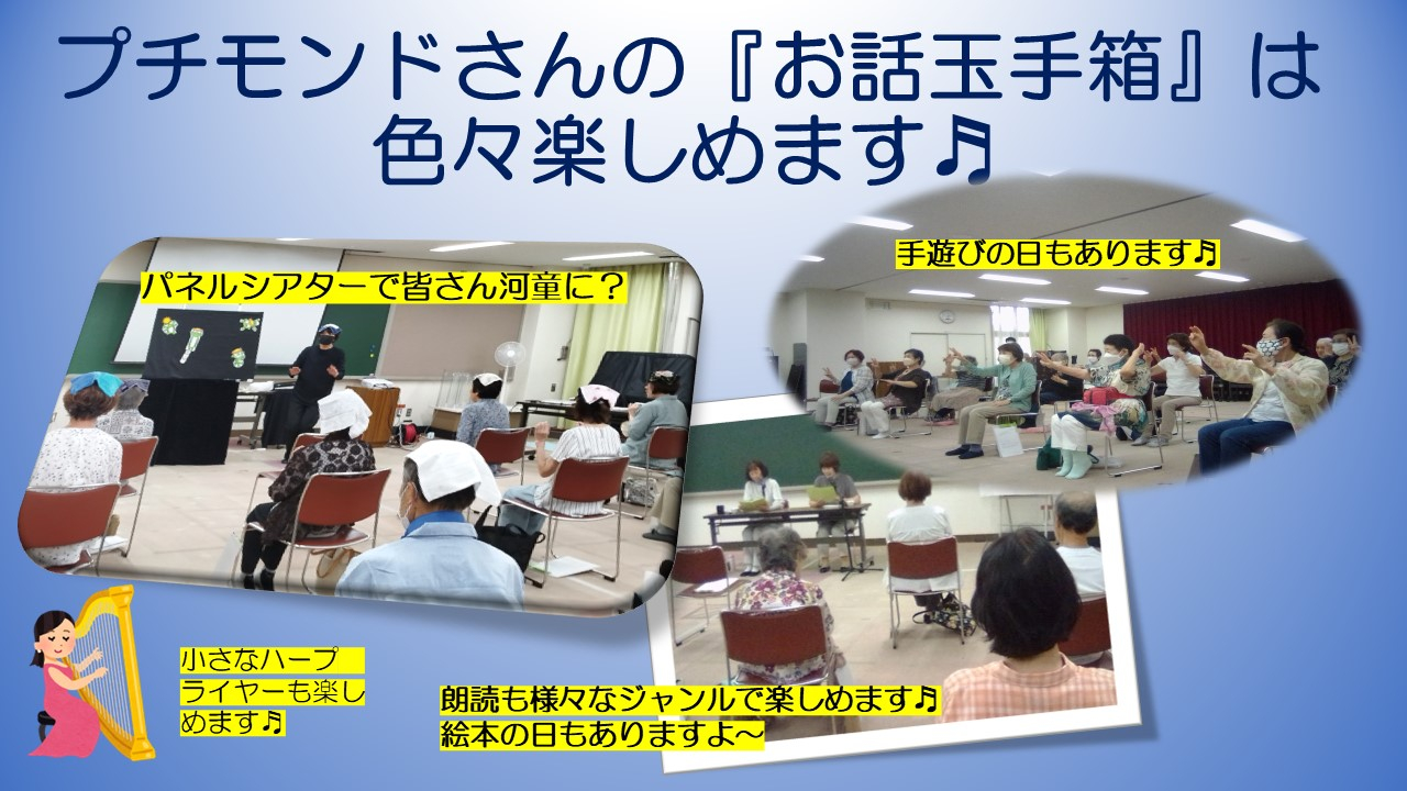 絵本?朗読?って質問がありましたので、プチモンドさんの『お話し玉手箱』を少しご紹介したいと思います。